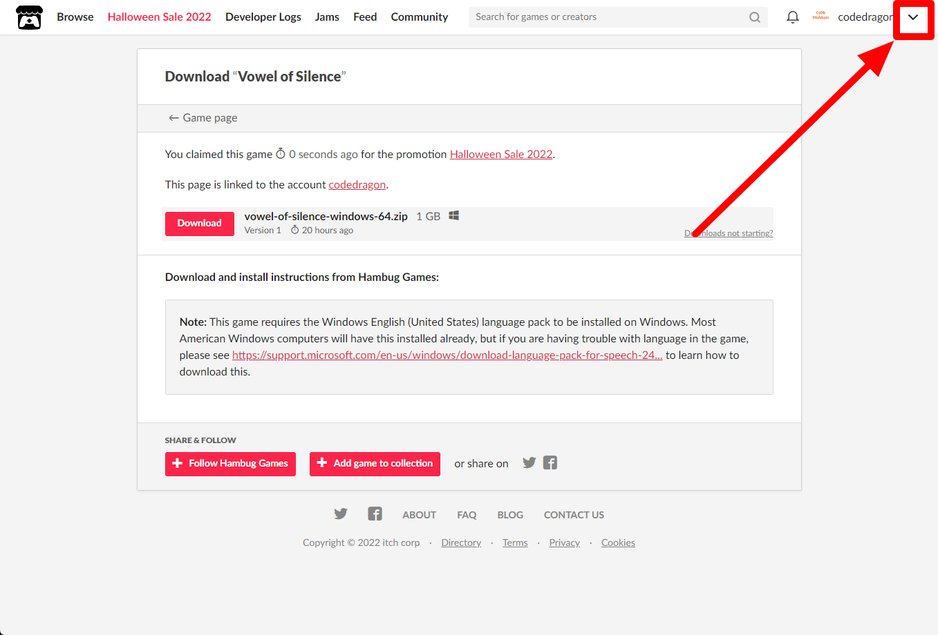 itch.io에서 받은 "Vowel of Silence" 게임 확인하고 설치파일 다운받아 보겠습니다. 우측 상단의 나의 사용자명 오른쪽의 화살표 아이콘을 클릭합니다.