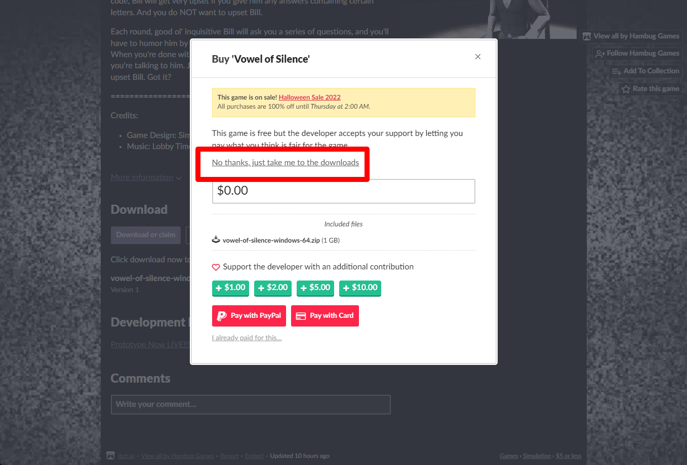 "Vowel of Silence" 구매창에서 [No thanks, just take me to the downloads] 링크를 클릭합니다.