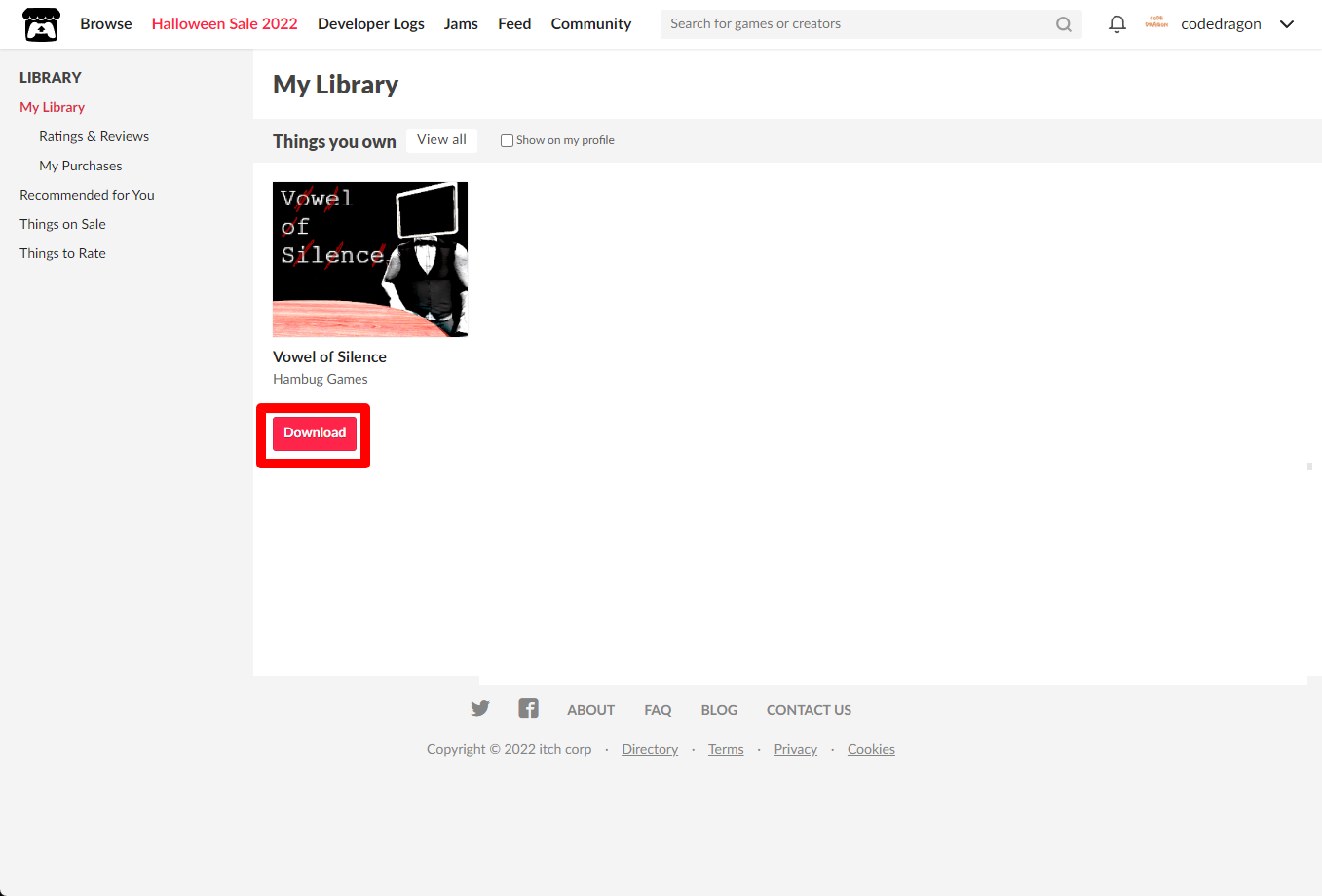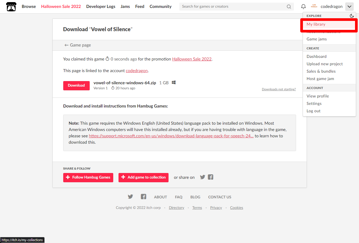 [Claim game]을 클릭하면 "Vowel of Silence" 게임이 나의 게임 라이브러리에 추가되고 설치파일을 다운받을 수 있는 페이지로 이동됩니다.