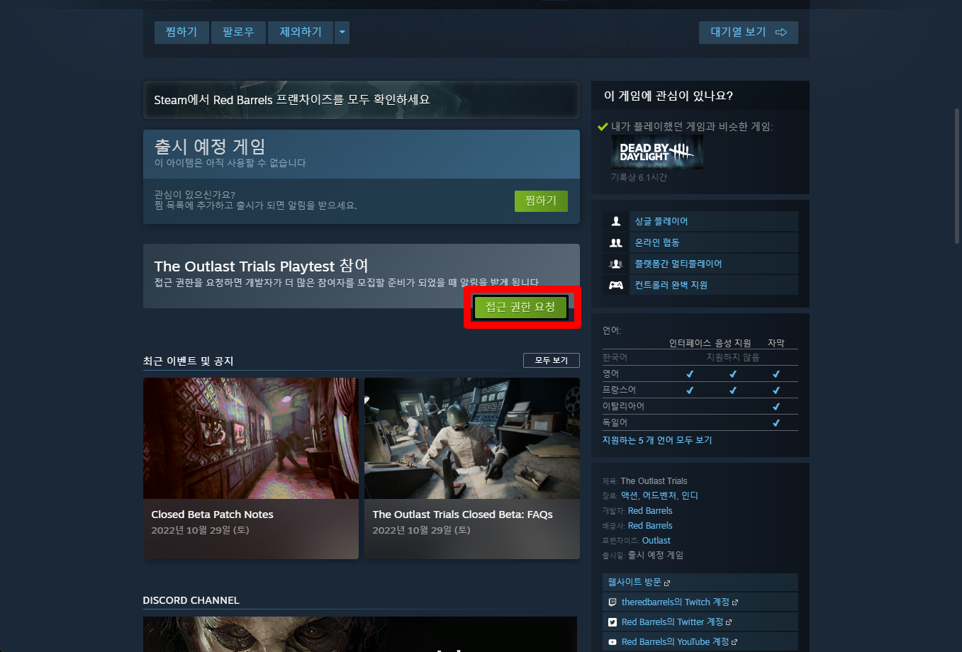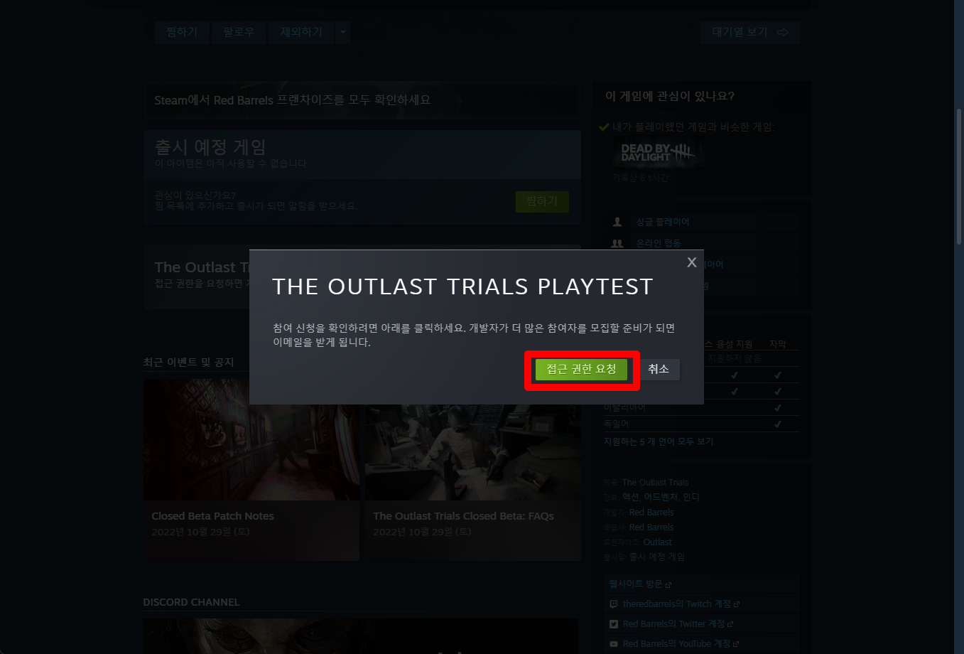 "The Outlast Trials" 게임페이지를 조금 내려서 [접근 권한 요청]을 클릭합니다.