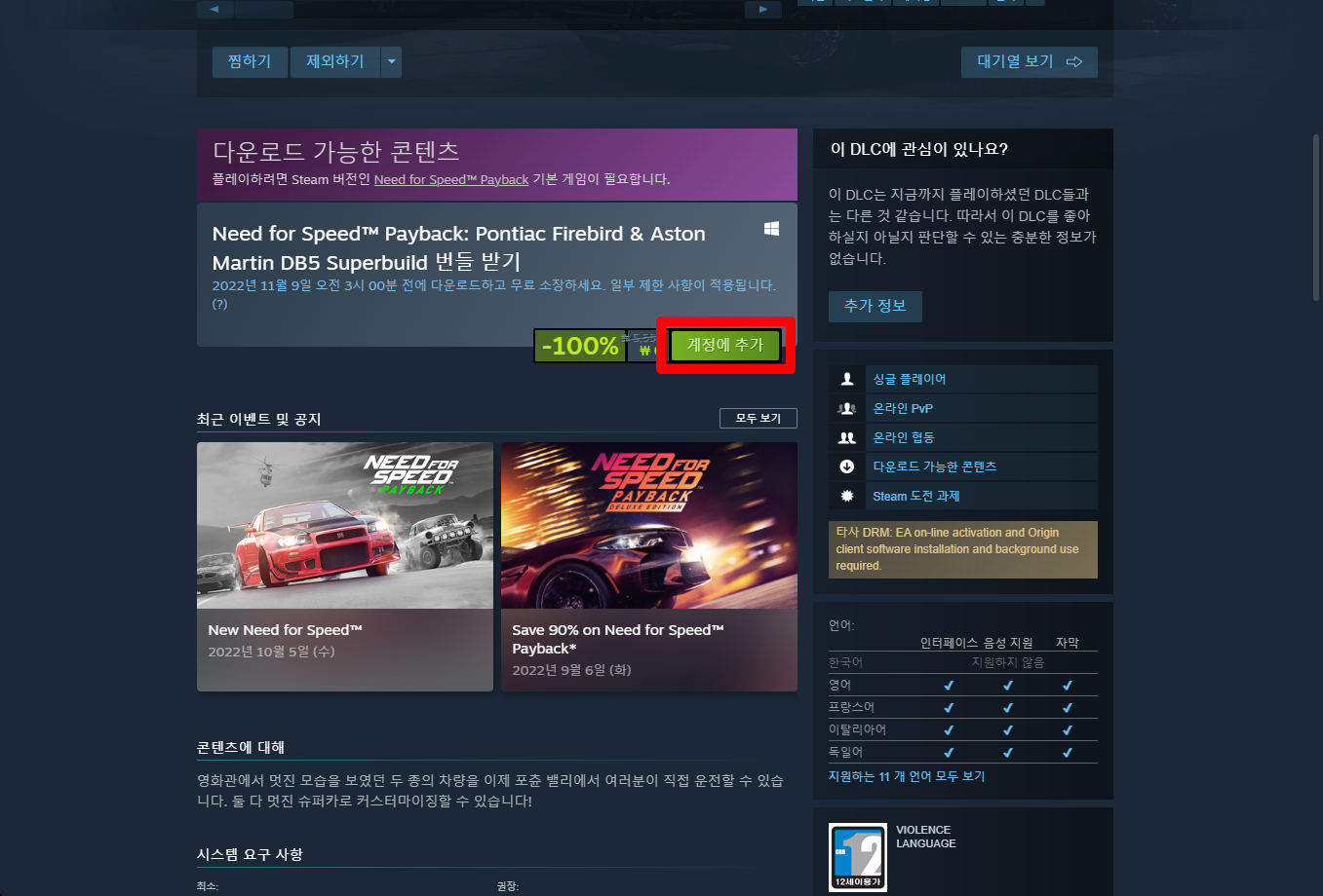 "Need for Speed™ Payback: Pontiac Firebird & Aston Martin DB5 Superbuild 번들" 게임페이지를 조금 내려준 후 [계정에 추가] 버튼을 클릭하면 게임라이브러리에 추가됩니다.