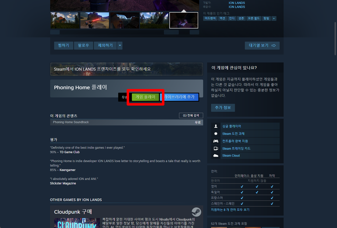 "Phoning Home" 페이지를 내려 [게임 플레이]를 클릭하면 됩니다.