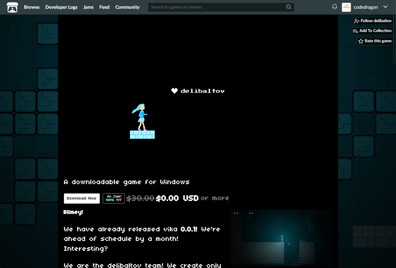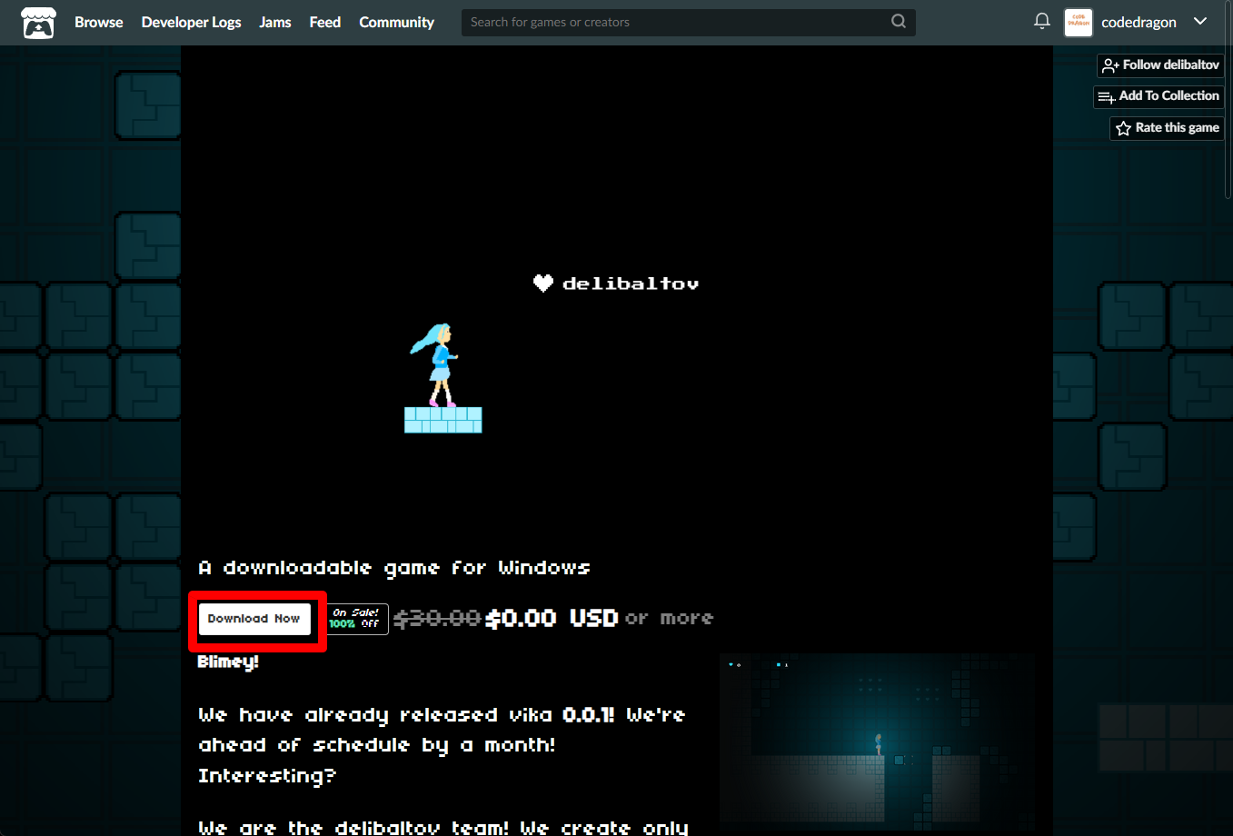 "vika - sandbox and platformer" 페이지에 있는 [Download Now]을 클릭합니다.