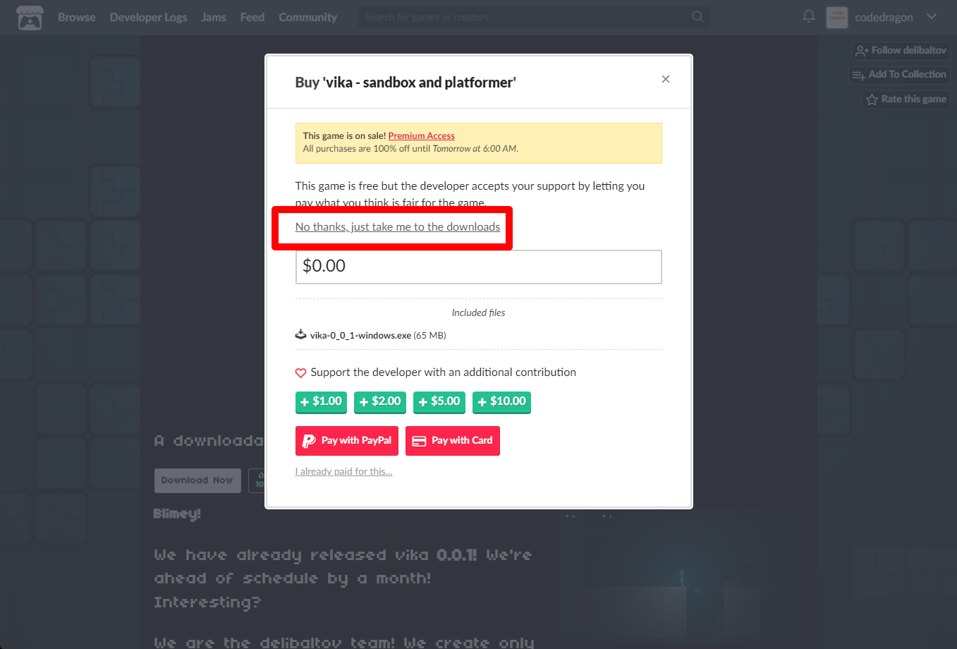 "vika - sandbox and platformer" 구매창에서 [No thanks, just take me to the downloads] 링크를 클릭합니다.