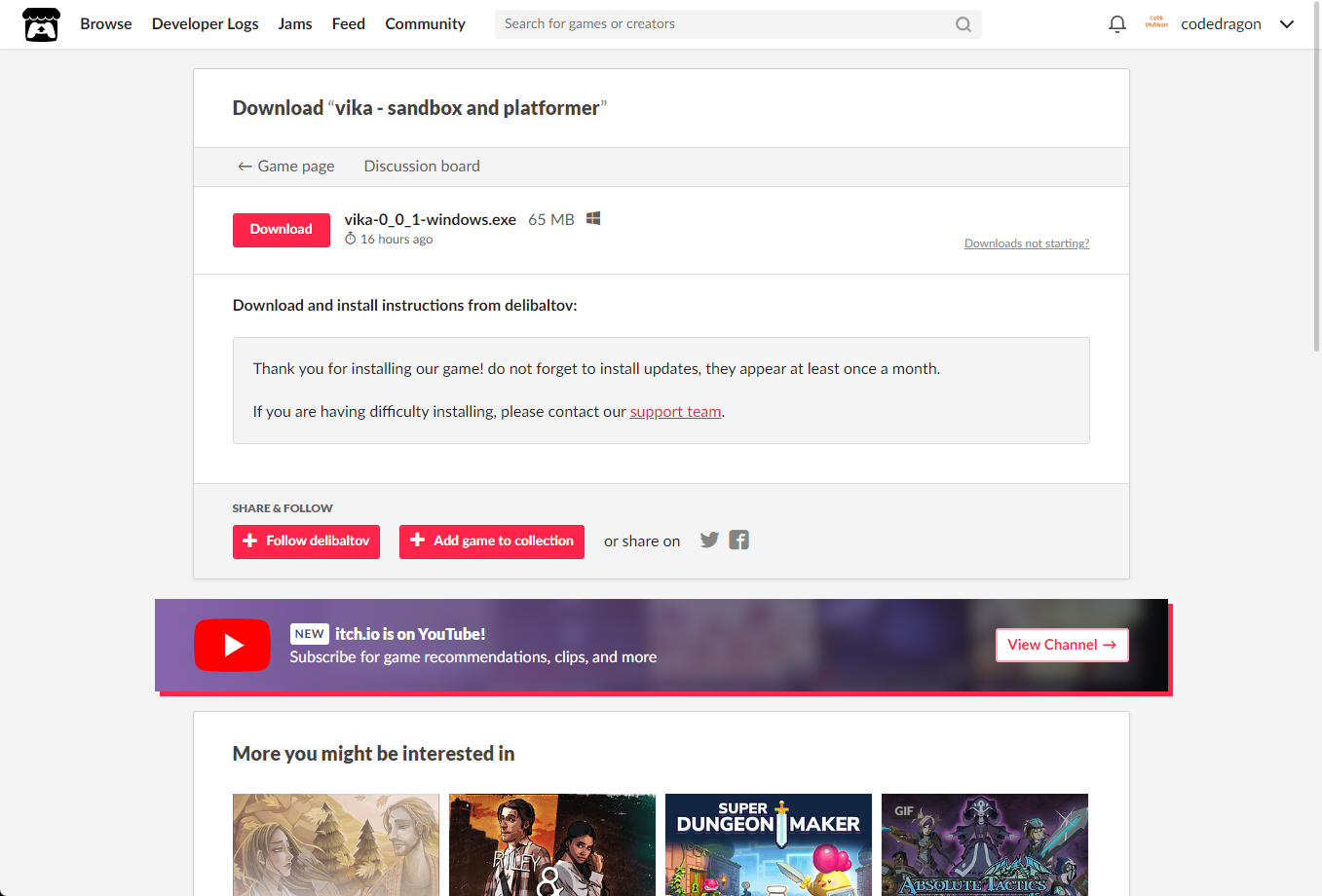 "vika - sandbox and platformer" 공식 페이지에 접속합니다.