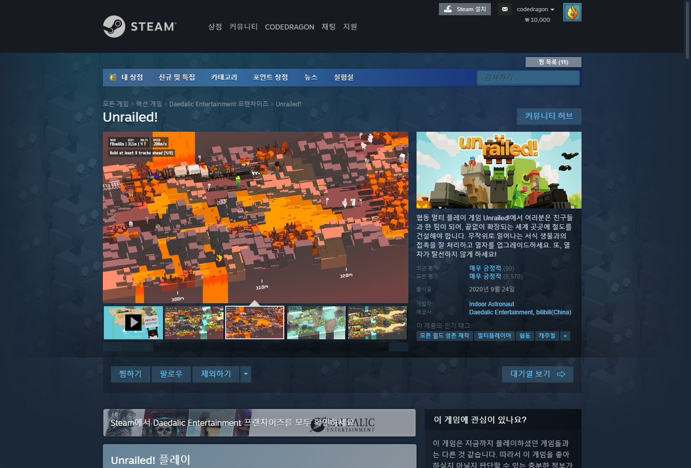 "Unrailed!" 게임페이지를 조금 내려서 [게임 플레이] 버튼을 클릭하면 됩니다.