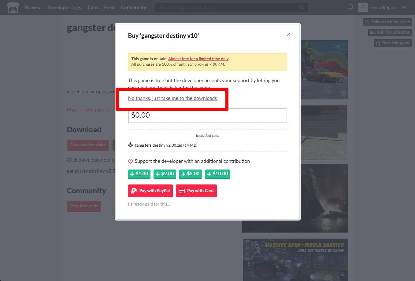 "gangster destiny v10" 구매창에서 [No thanks, just take me to the downloads] 링크를 클릭합니다.