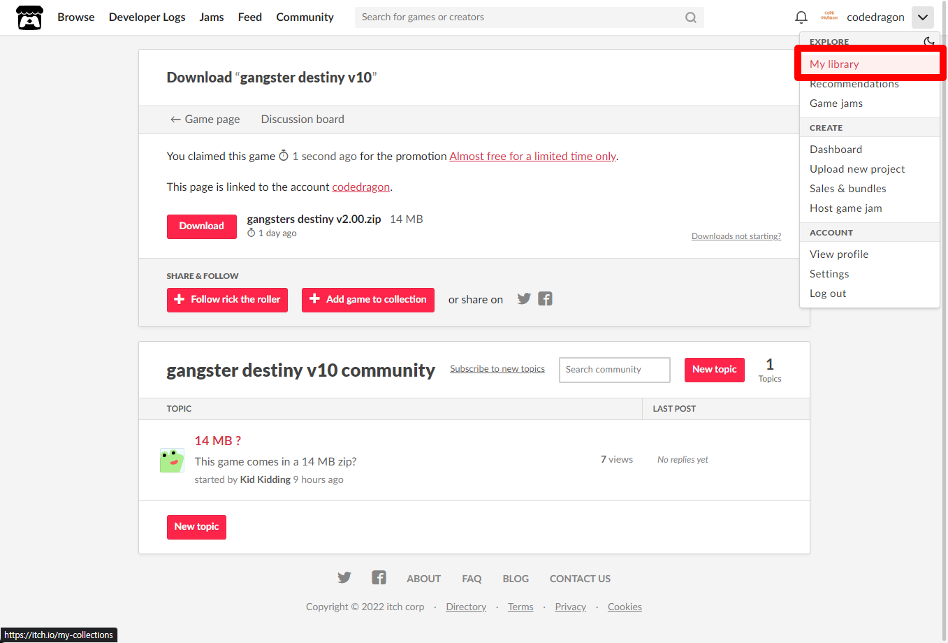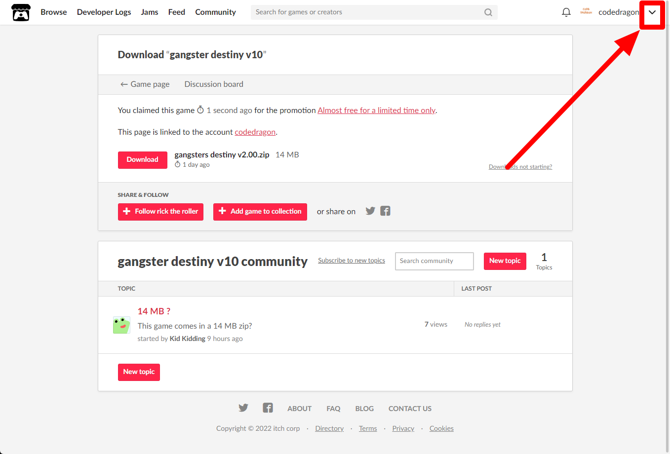 itch.io에서 받은 "gangster destiny v10" 게임 확인하고 설치파일 다운받아 보겠습니다. 우측 상단의 나의 사용자명 오른쪽의 화살표 아이콘을 클릭합니다.
