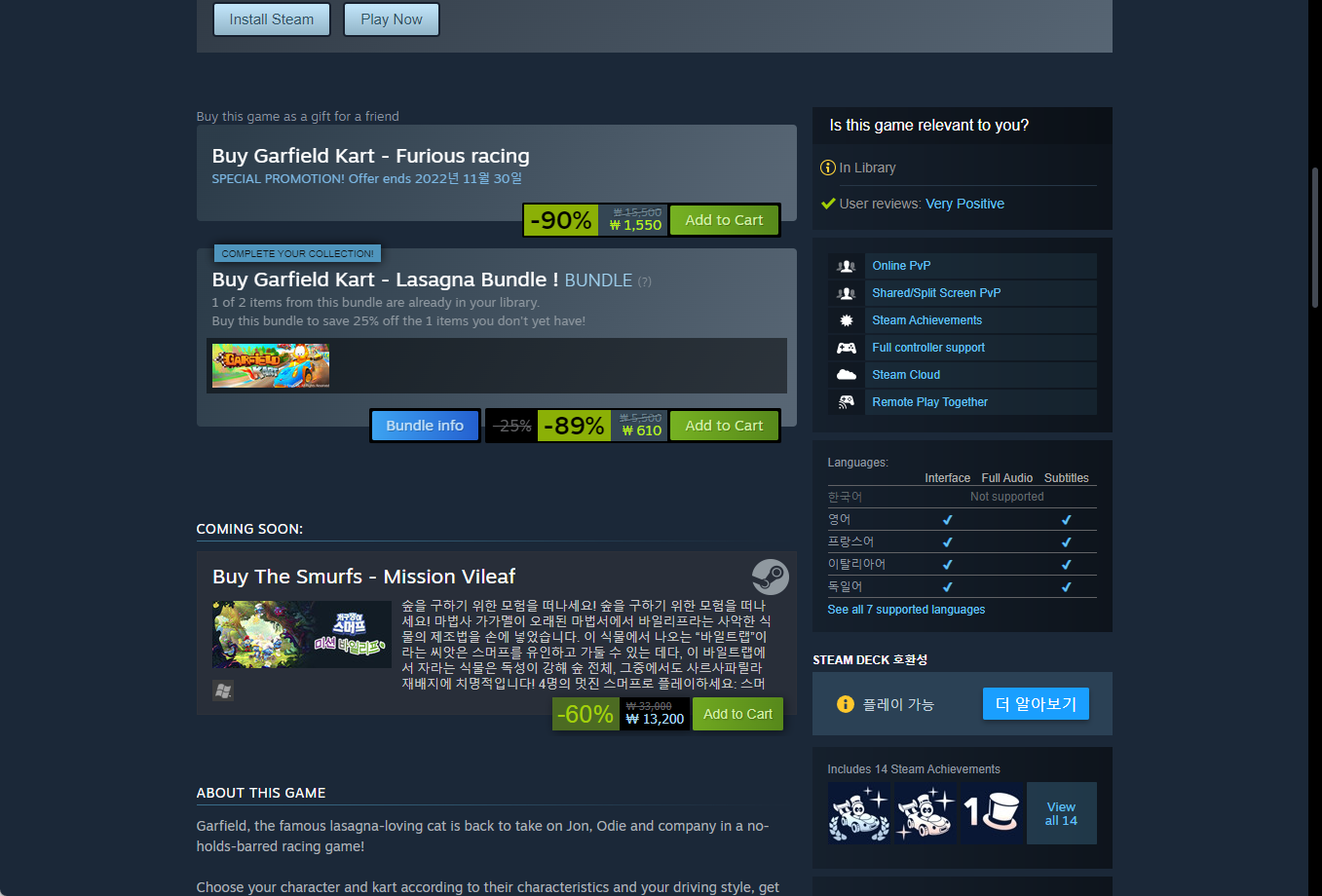 "Garfield Kart - Furious Racing" - Steam 스팀 게임페이지