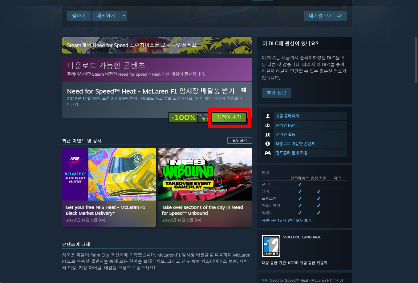 "Need for Speed™ Heat - McLaren F1 암시장 배달품" 게임페이지를 조금 내려준 후 [계정에 추가] 버튼을 클릭하면 게임라이브러리에 추가됩니다.