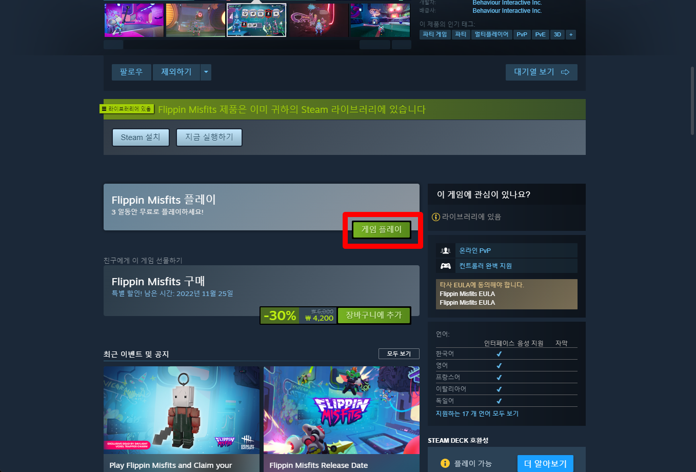 "Flippin Misfits" 게임페이지를 조금 내려서 [게임 플레이] 버튼을 클릭하면 됩니다.