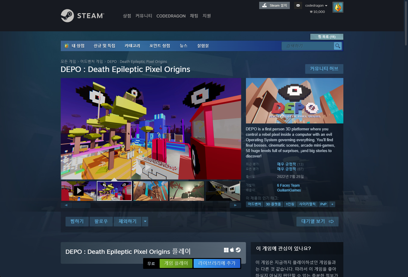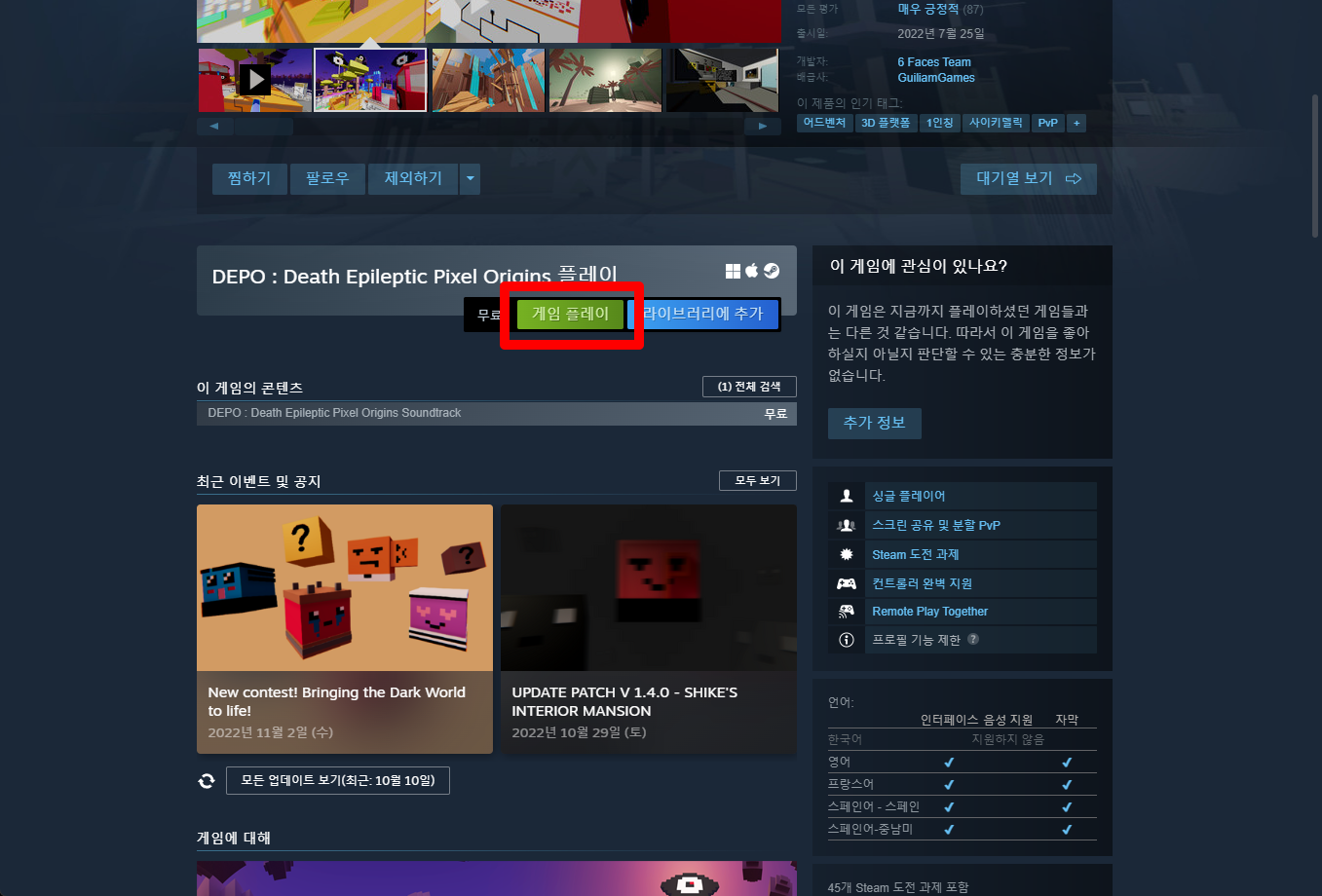 "DEPO : Death Epileptic Pixel Origins" 페이지를 내려 [게임 플레이]를 클릭하면 됩니다.