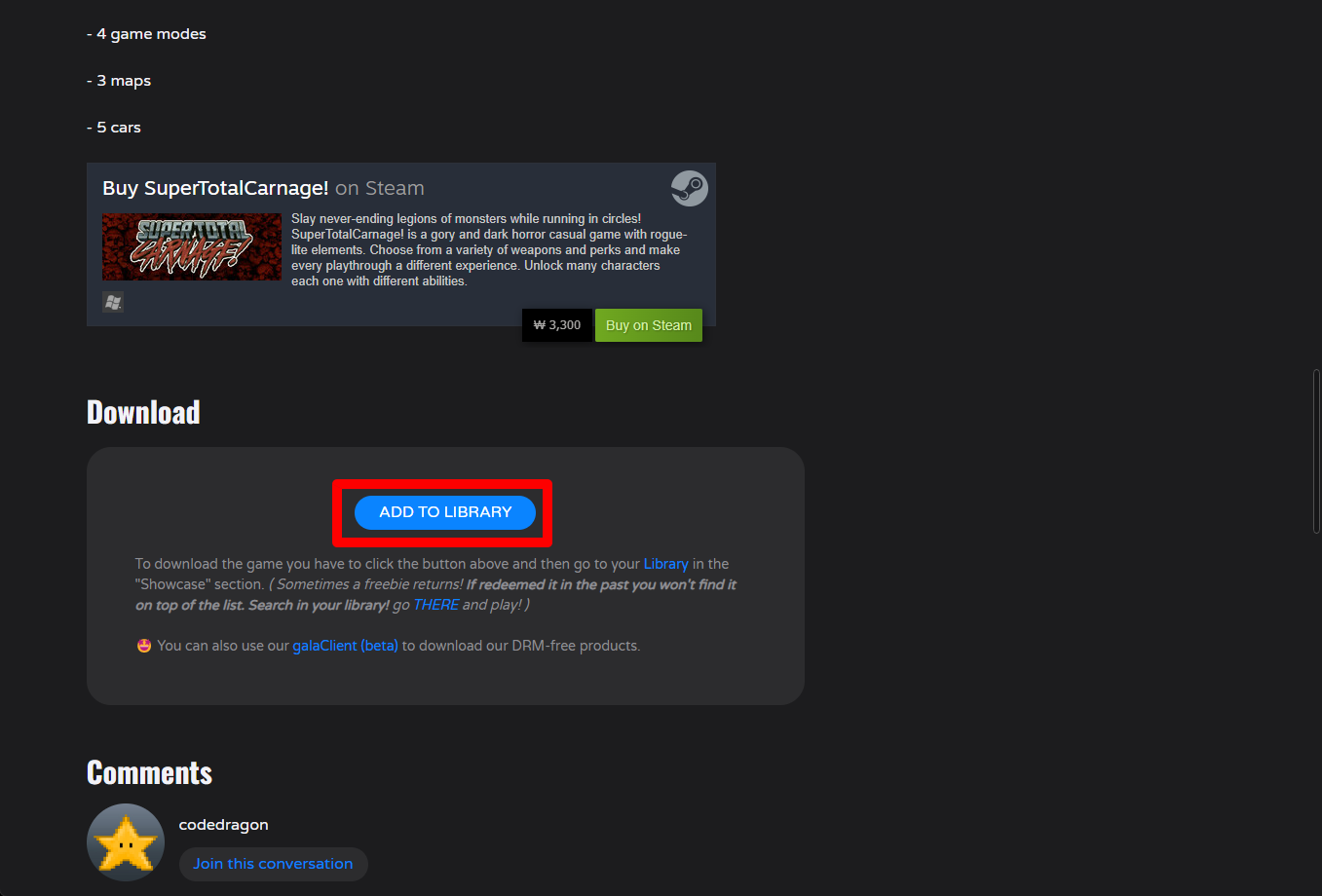 "Extreme Racing on Highway" 게임 페이지를 내려 [ADD TO LIBRARY]를 클릭합니다.