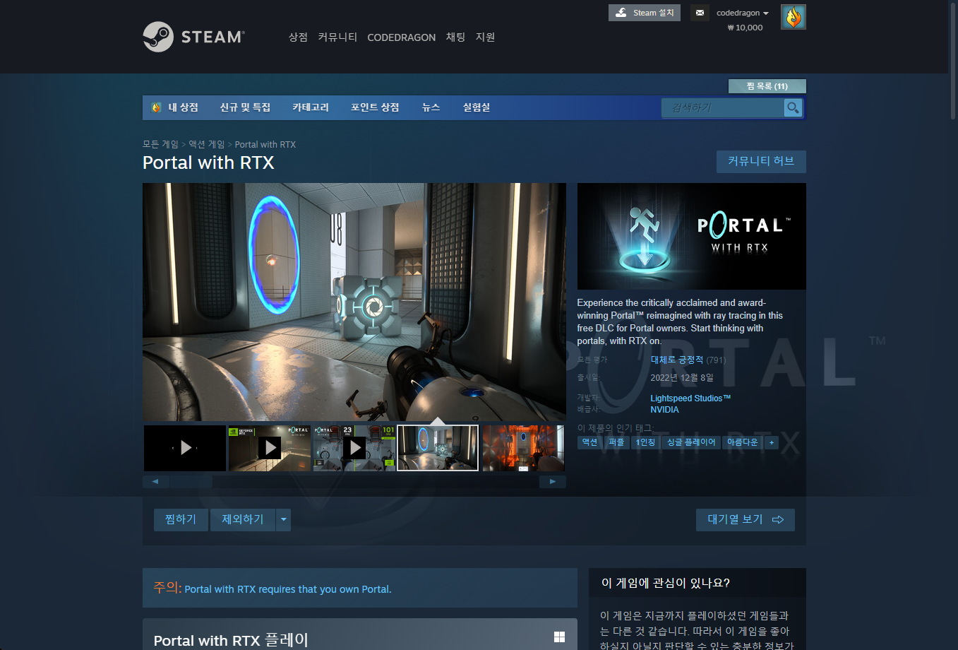 "Portal with RTX" DLC를 받기 위해서는 기본게임인 "Portal"를 가지고 있거나 구매해야 합니다.