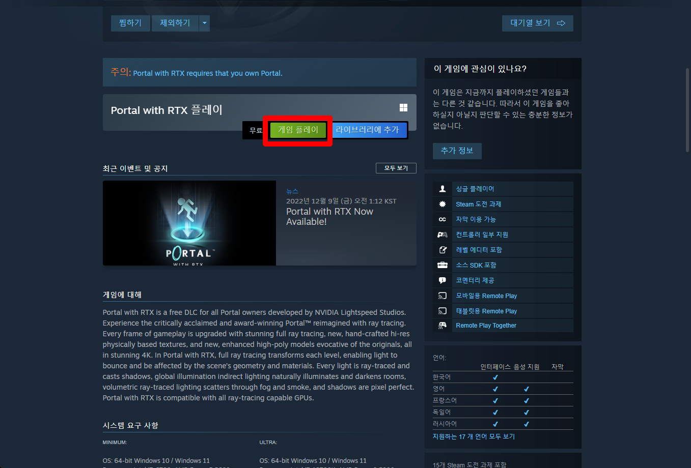 "Portal with RTX" 페이지를 내려 [게임 플레이]를 클릭하면 됩니다.