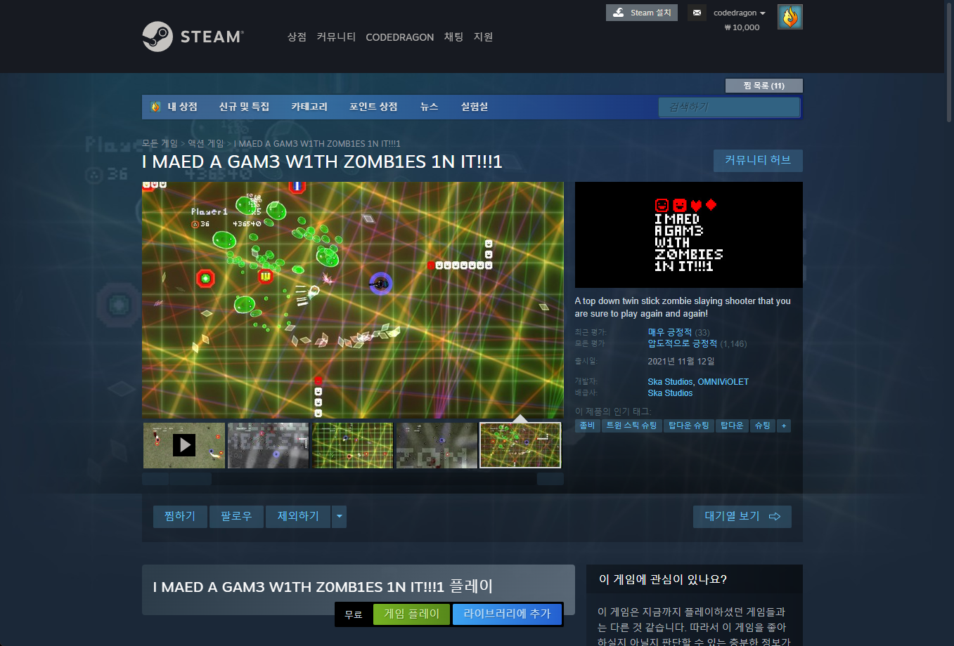 "I MAED A GAM3 W1TH Z0MB1ES 1N IT!!!1" 스팀 페이지 입니다.