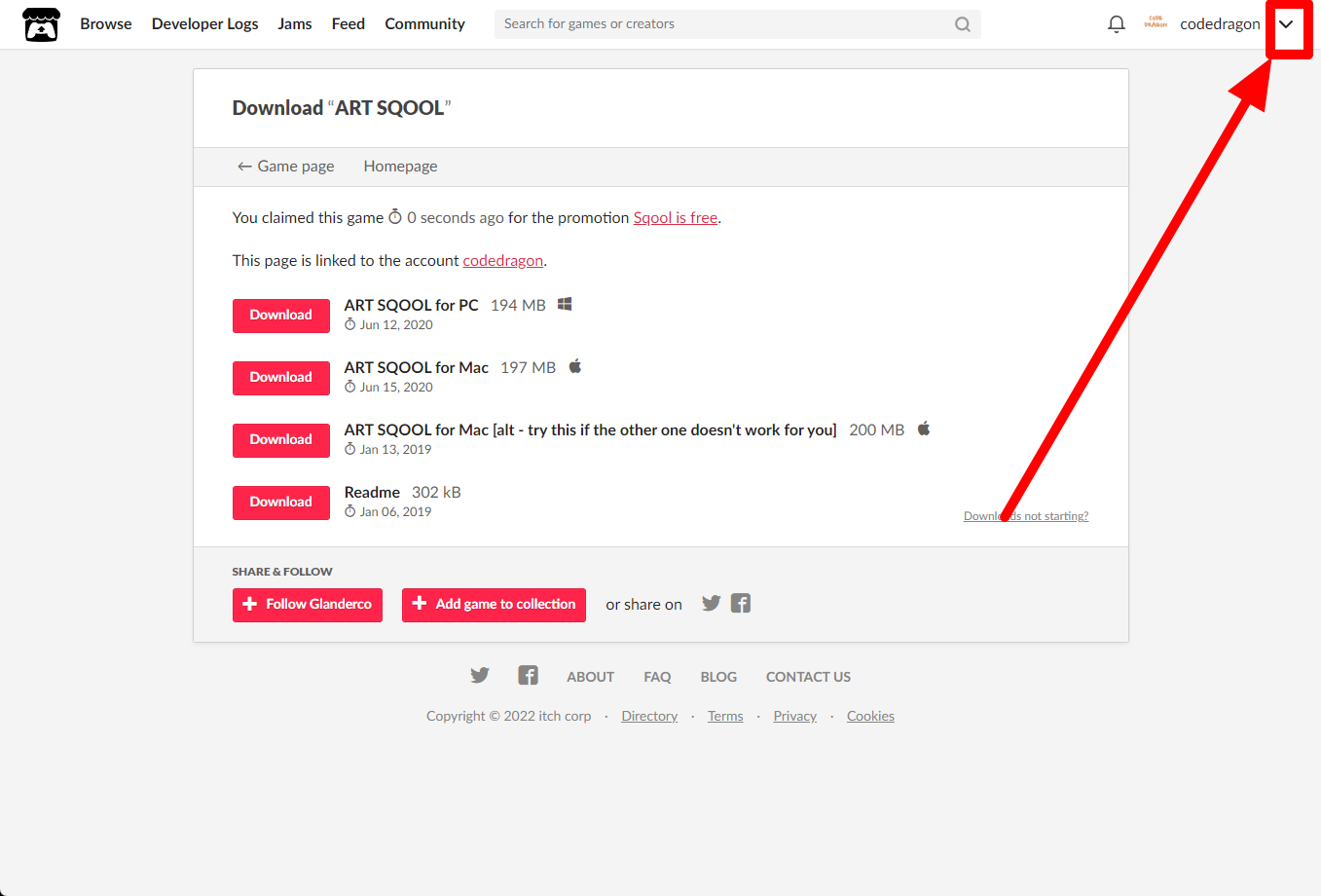 itch.io에서 받은 "ART SQOOL" 게임 확인하고 설치파일 다운받아 보겠습니다. 우측 상단의 나의 사용자명 오른쪽의 화살표 아이콘을 클릭합니다.