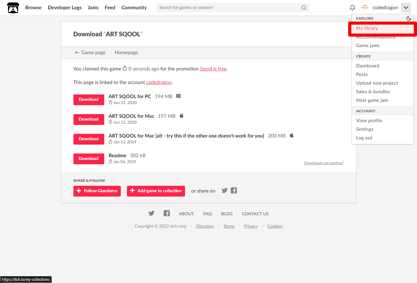 [Claim game]을 클릭하면 "ART SQOOL" 게임이 나의 게임 라이브러리에 추가되고 설치파일을 다운받을 수 있는 페이지로 이동됩니다.