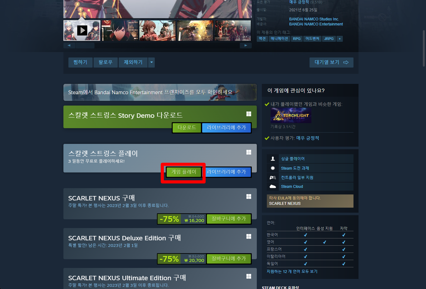 "SCARLET NEXUS" 게임페이지를 조금 내려서 [게임 플레이] 버튼을 클릭하면 됩니다.