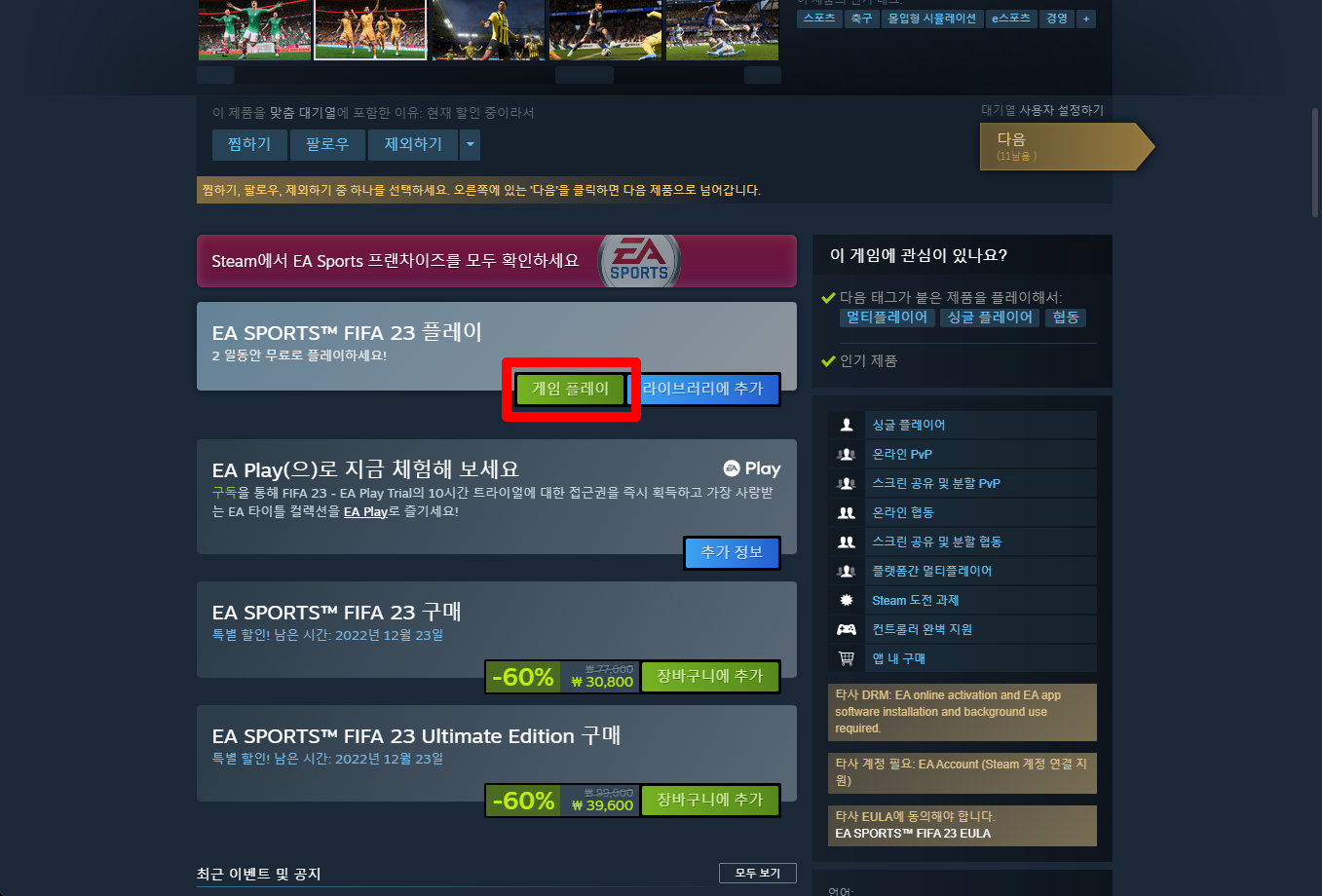 "EA SPORTS™ FIFA 23" 게임페이지를 조금 내려서 [게임 플레이] 버튼을 클릭하면 됩니다.