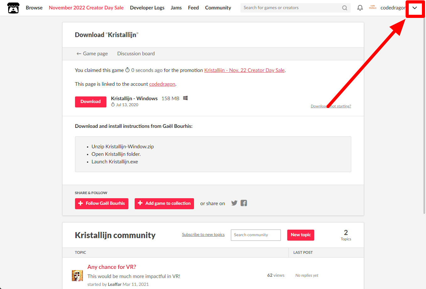 itch.io에서 받은 "Kristallijn" 게임 확인하고 설치파일 다운받아 보겠습니다. 우측 상단의 나의 사용자명 오른쪽의 화살표 아이콘을 클릭합니다.