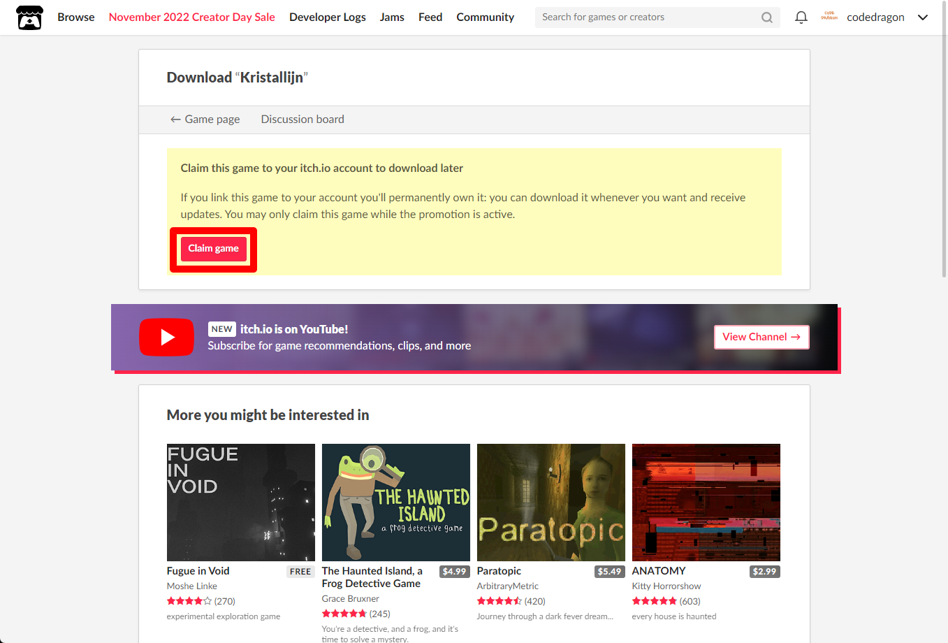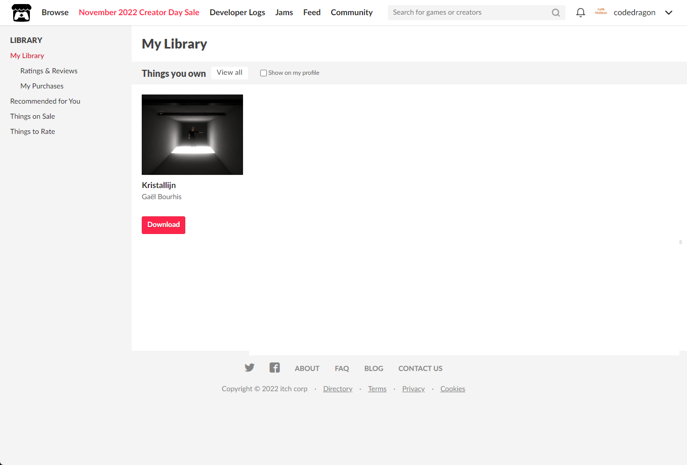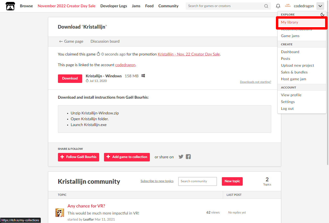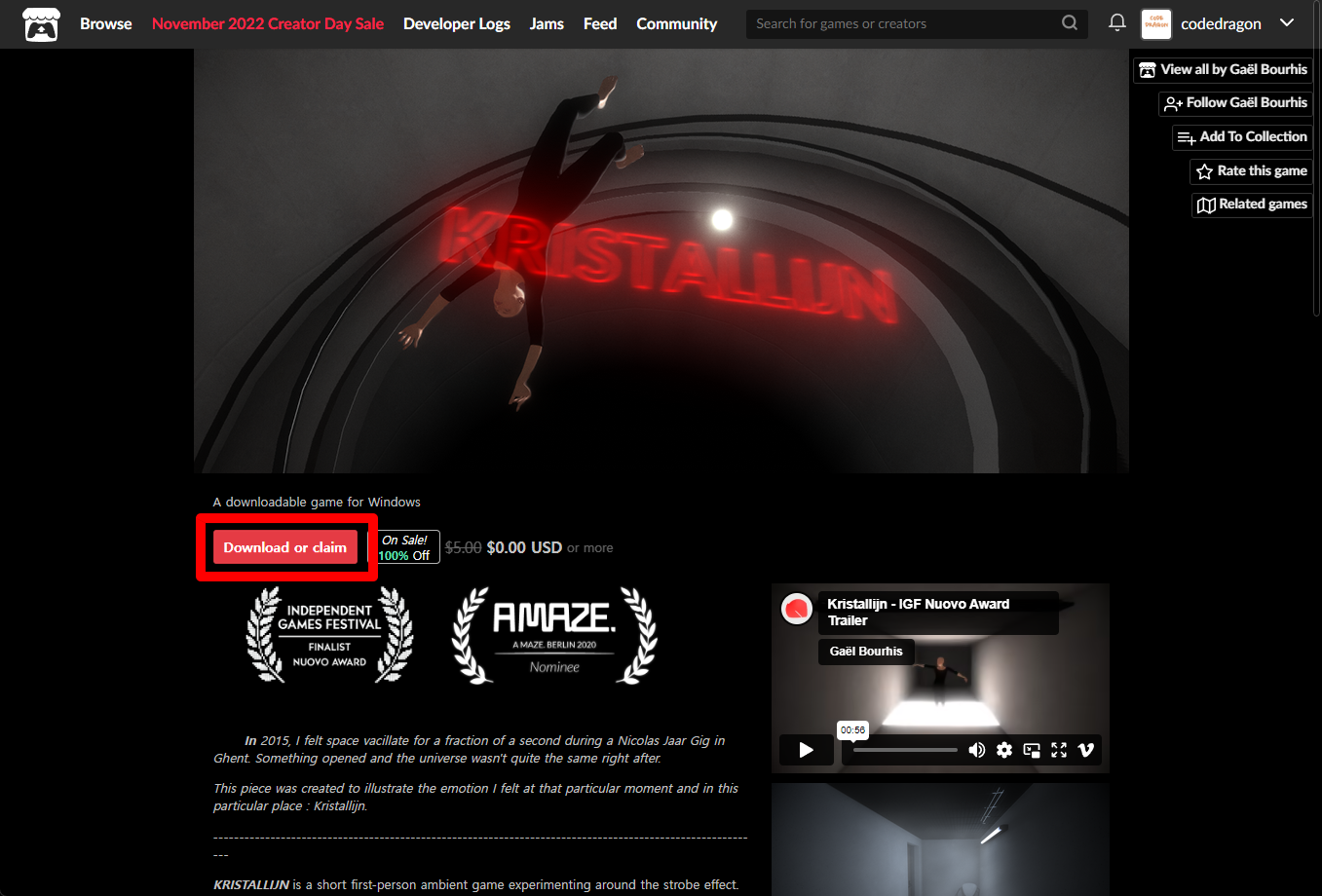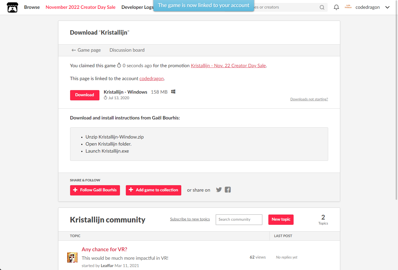 [Claim game]을 클릭하면 "Kristallijn" 게임이 나의 게임 라이브러리에 추가되고 설치파일을 다운받을 수 있는 페이지로 이동됩니다.