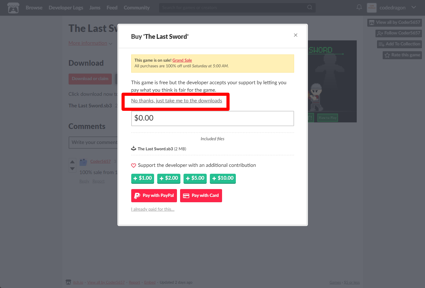 "The Last Sword" 구매창에서 [No thanks, just take me to the downloads] 링크를 클릭합니다.