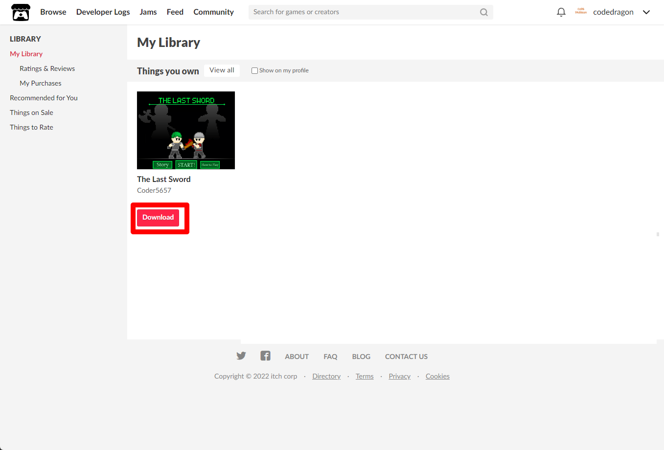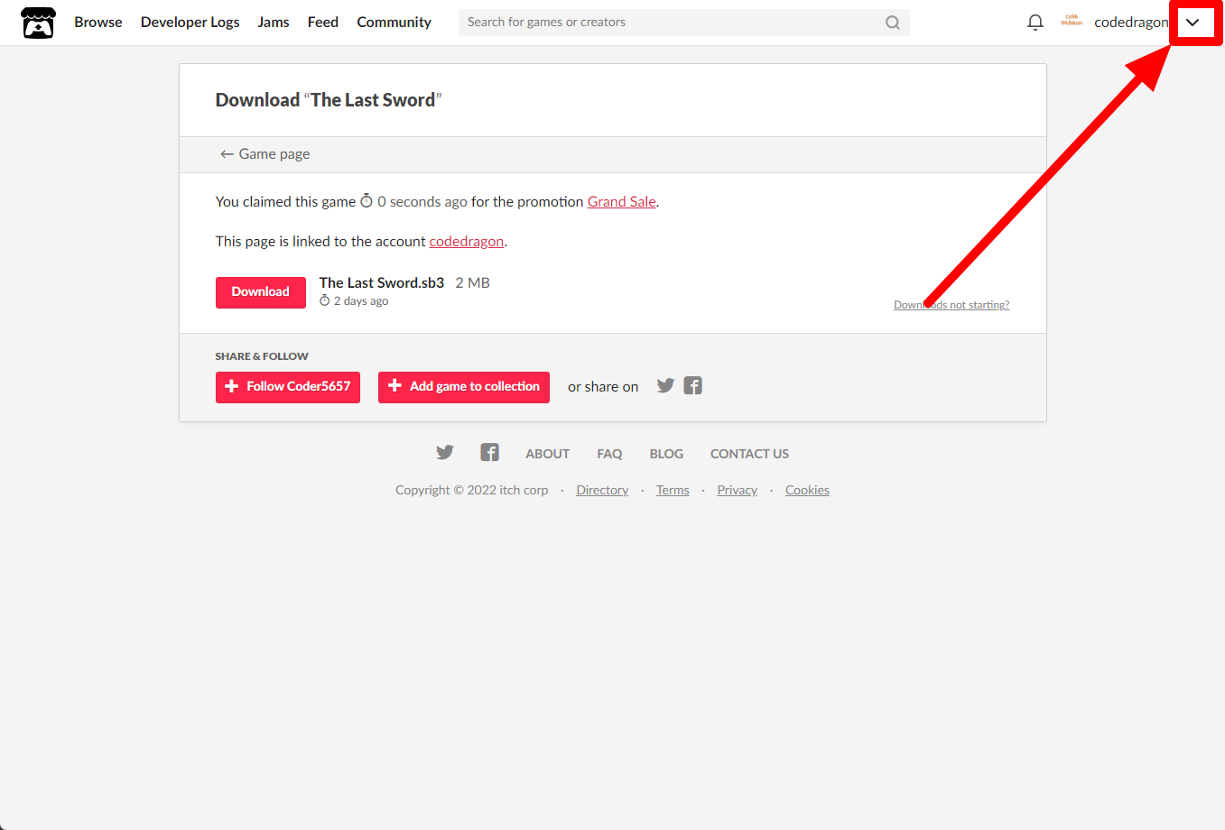itch.io에서 받은 "The Last Sword" 게임 확인하고 설치파일 다운받아 보겠습니다. 우측 상단의 나의 사용자명 오른쪽의 화살표 아이콘을 클릭합니다.