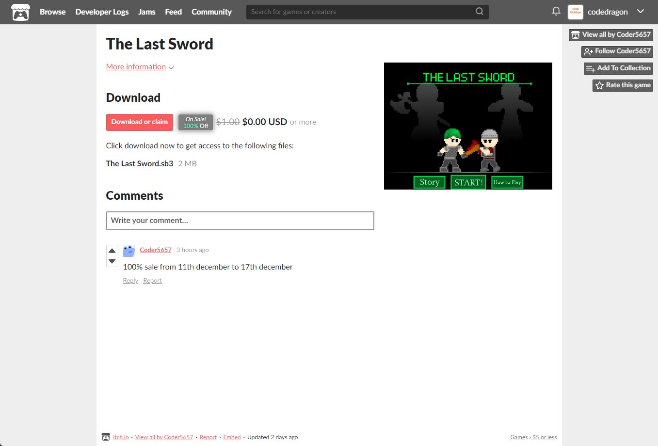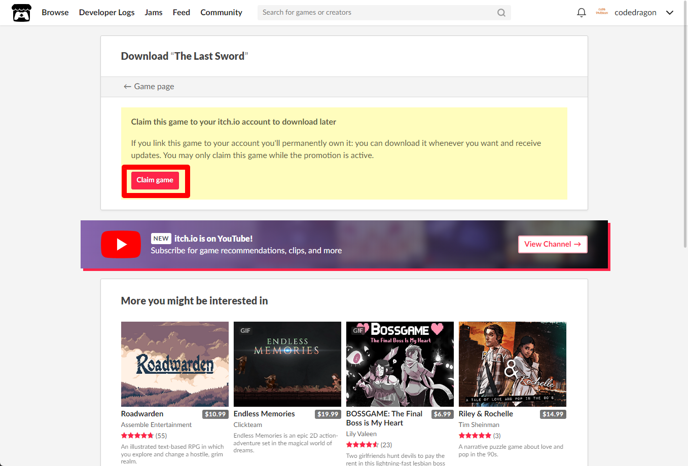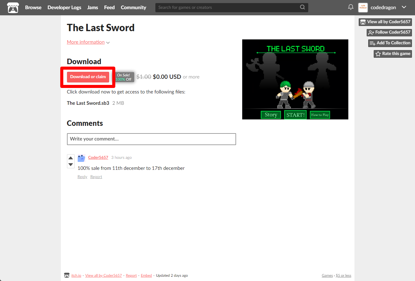 "The Last Sword" 페이지에 있는 [Download or claim]을 클릭합니다.