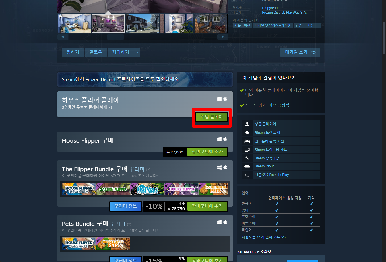 "House Flipper" 게임페이지를 조금 내려서 [게임 플레이] 버튼을 클릭하면 됩니다.