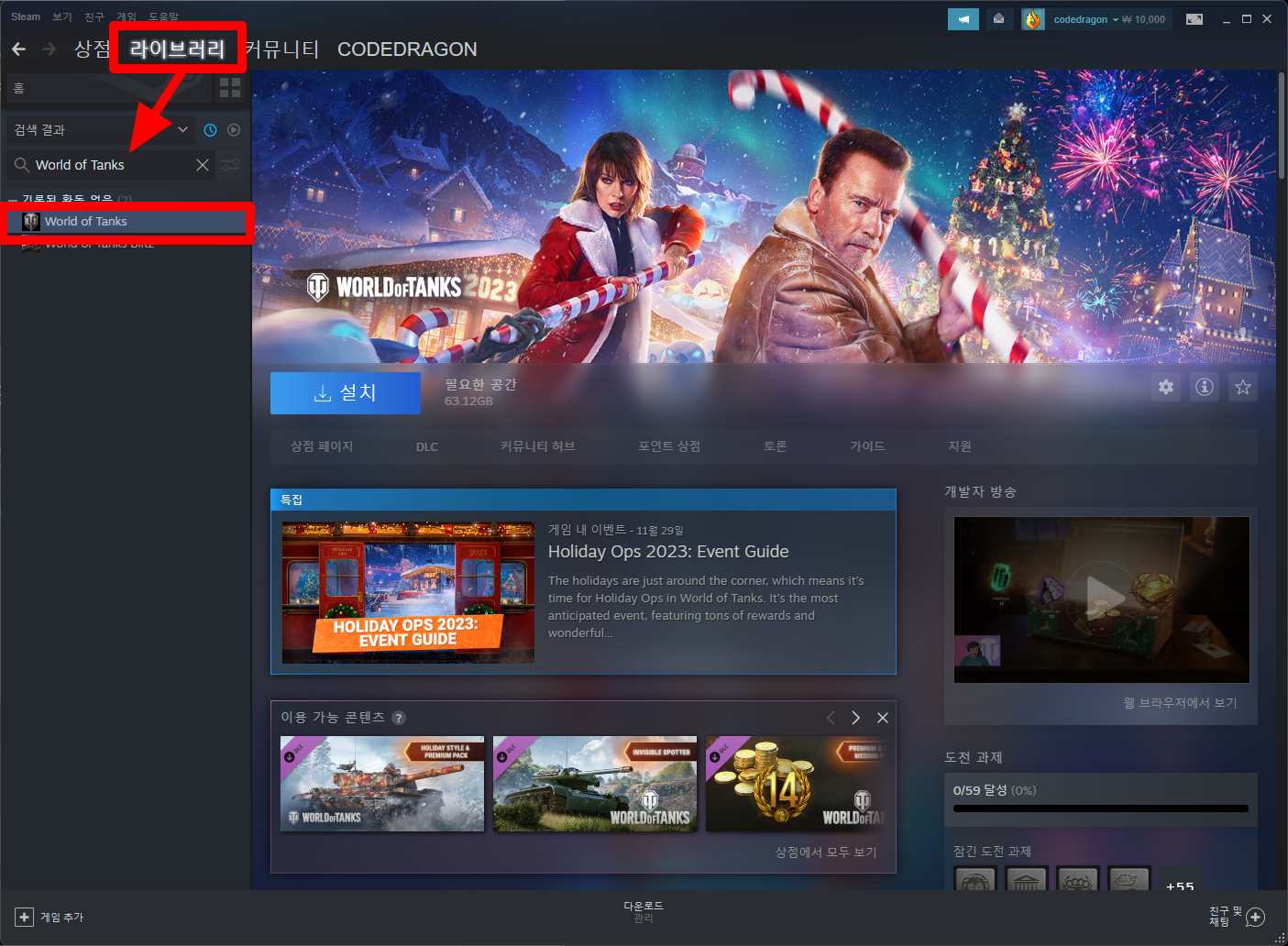 스팀런처의 상단 [라이브러리] 메뉴에서 방금 받은 "World of Tanks — Holiday Gift Pack" 게임을 확인할 수 있습니다.