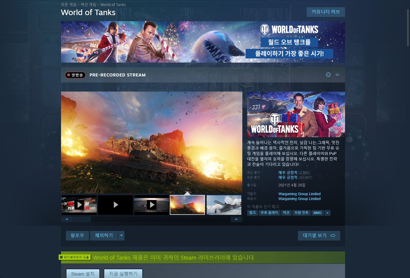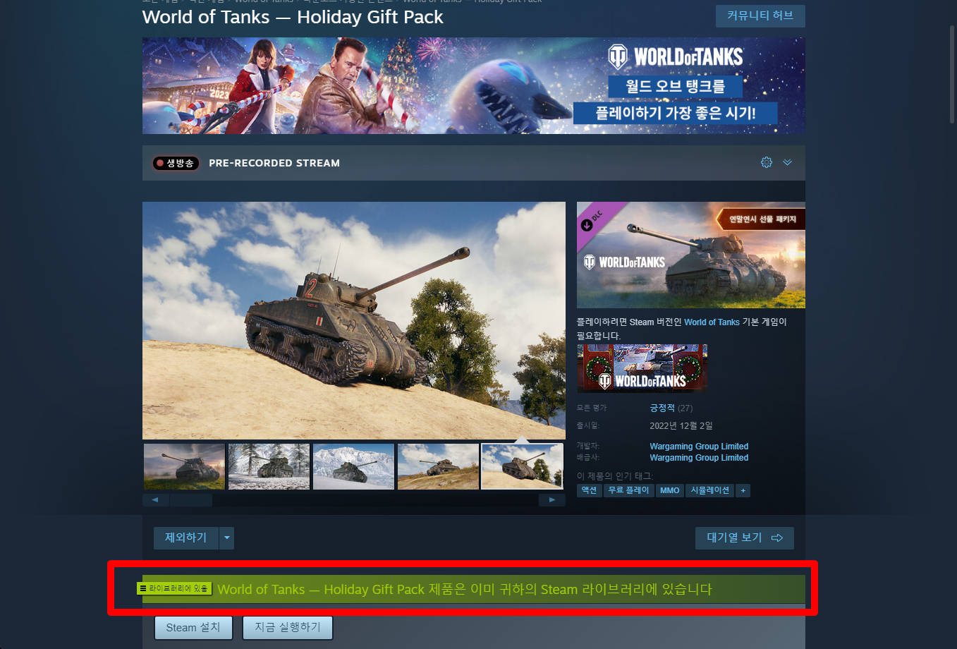 다시 "World of Tanks — Holiday Gift Pack" 게임페이지로 돌아와 보면 녹색으로 게임라이브러리에 추가되었음을 확인할 수 있습니다.