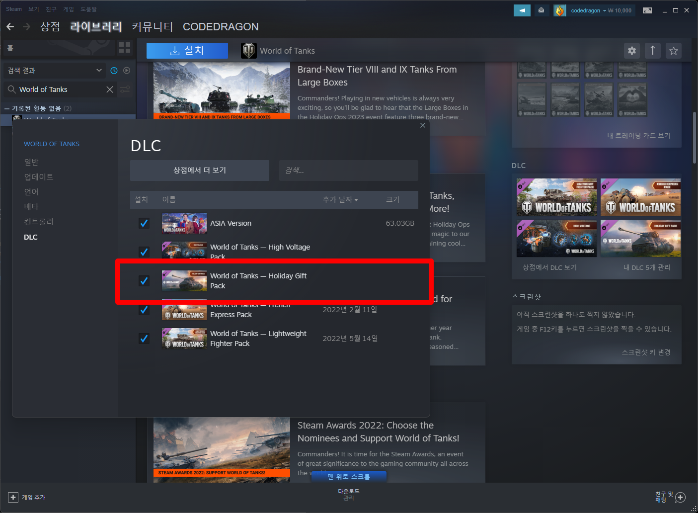 DLC관리창에서 방금 받은 "World of Tanks — Holiday Gift Pack" DLC 항목을 확인할 수 있습니다.