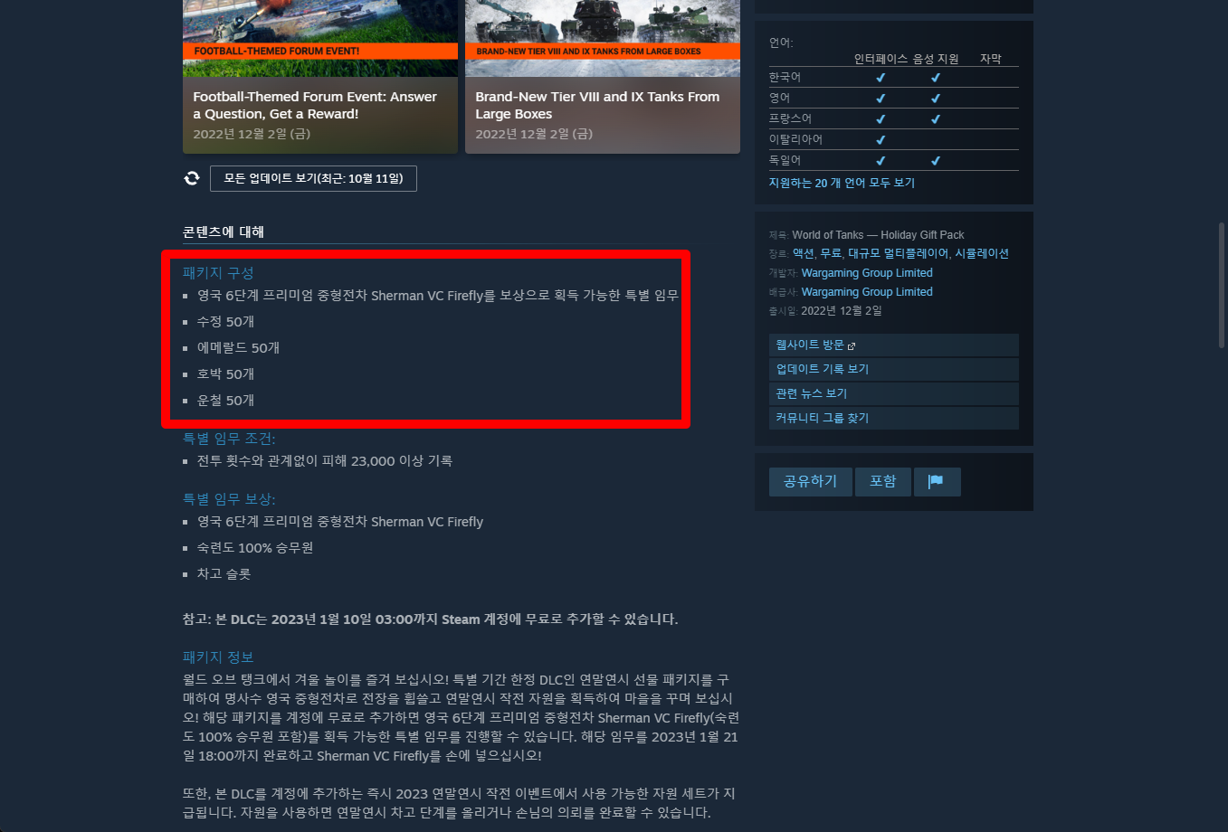- "World of Tanks — Holiday Gift Pack" 게임 페이지 확인
