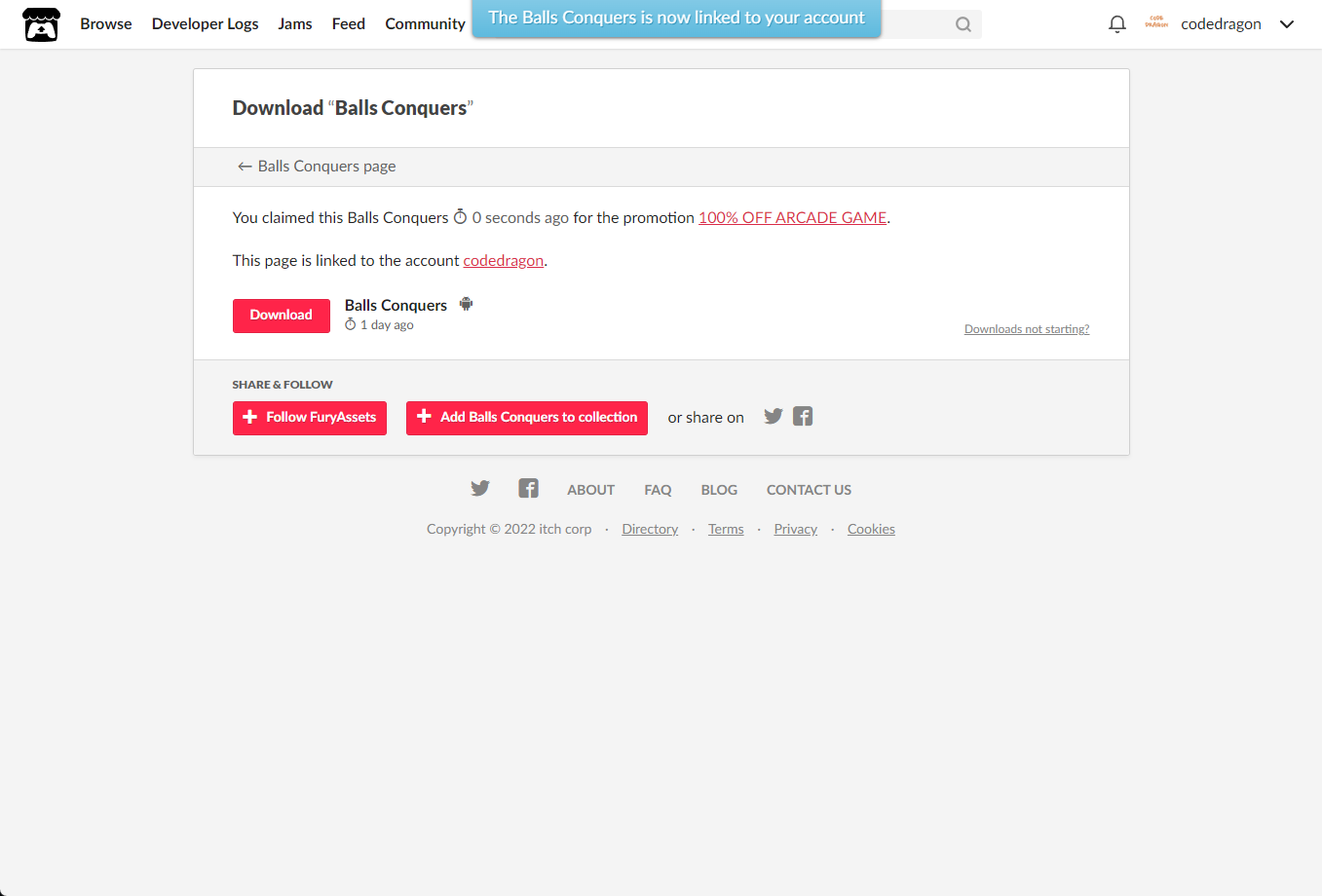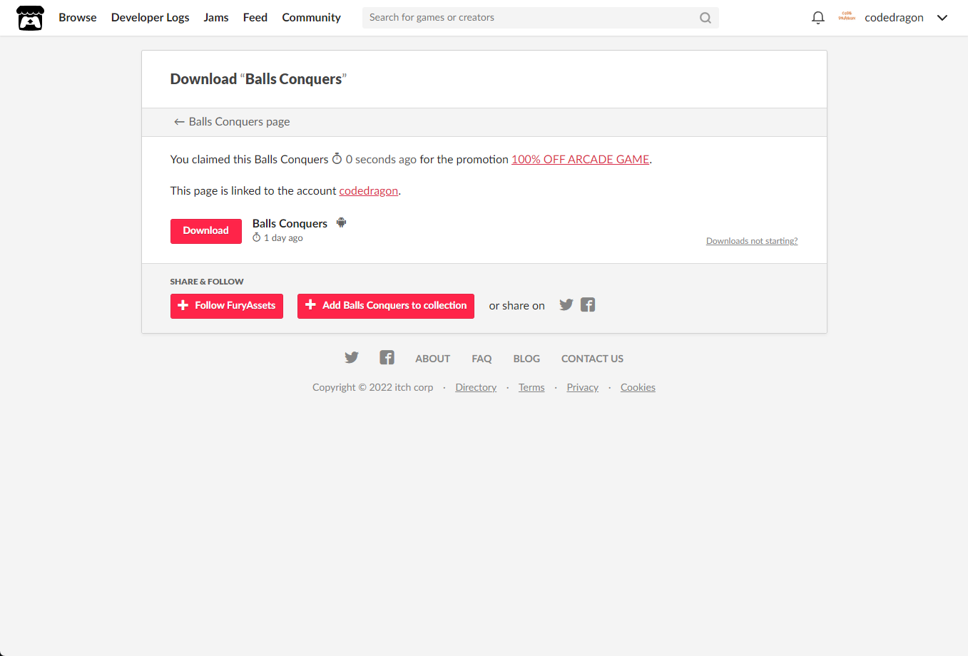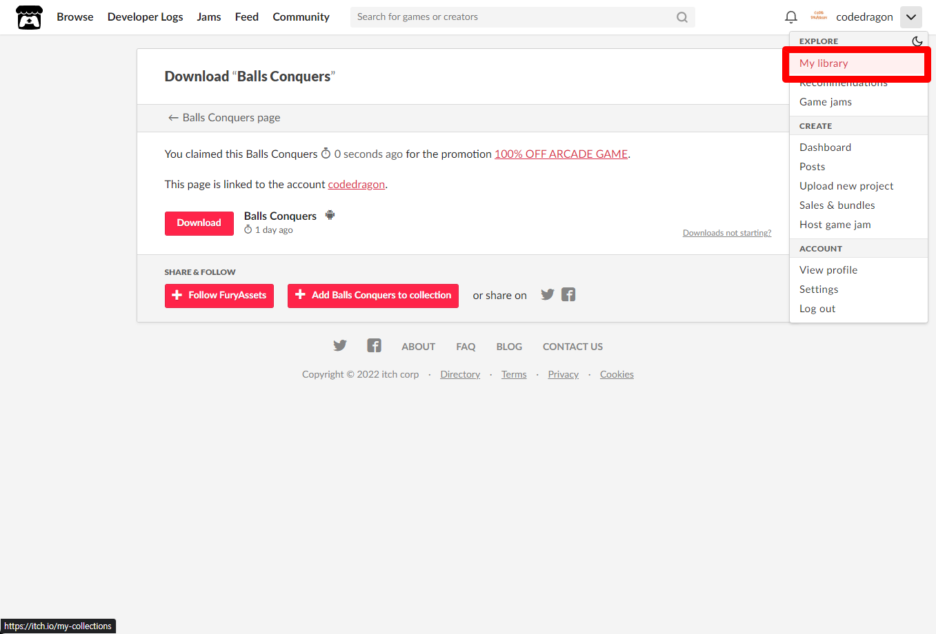 [Claim Balls Conquers]을 클릭하면 "Balls Conquers" 게임이 나의 게임 라이브러리에 추가되고 설치파일을 다운받을 수 있는 페이지로 이동됩니다.