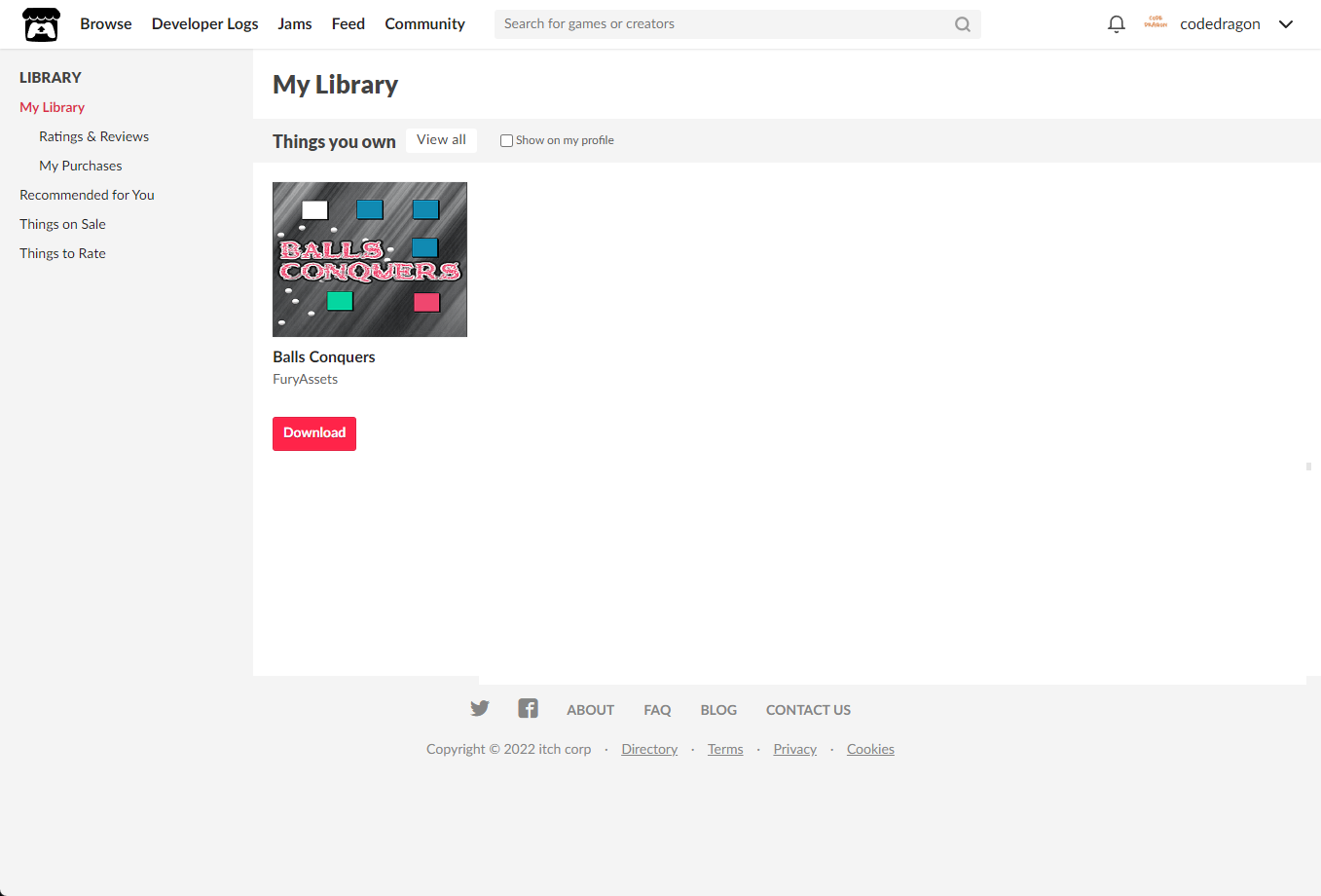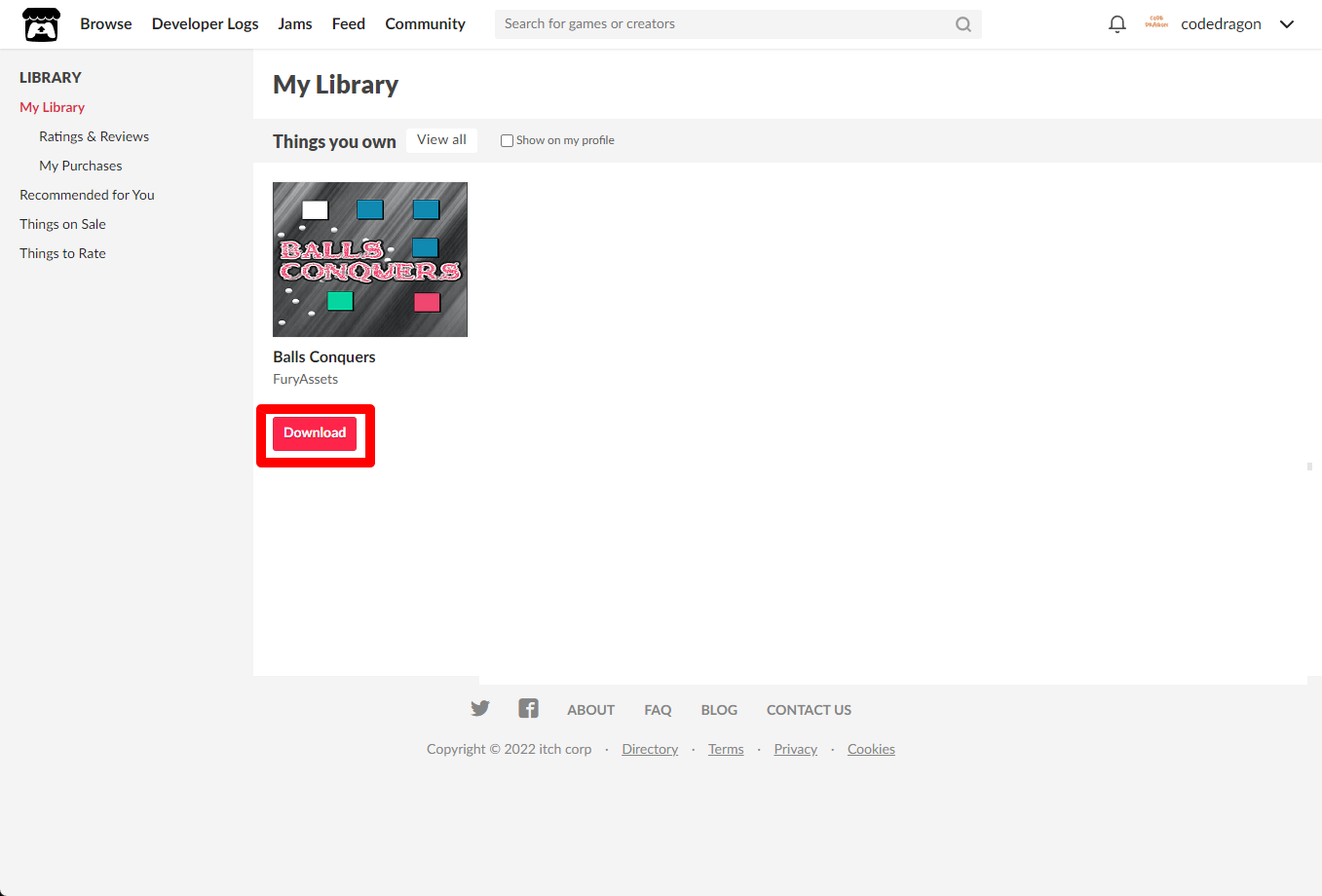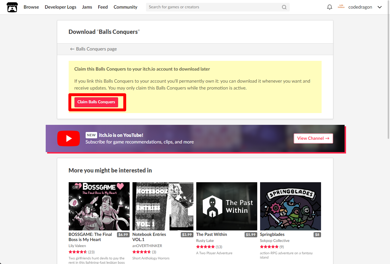 [Claim Balls Conquers]을 클릭하면 "Balls Conquers" 게임이 나의 게임 라이브러리에 추가되고 설치파일을 다운받을 수 있는 페이지로 이동됩니다.