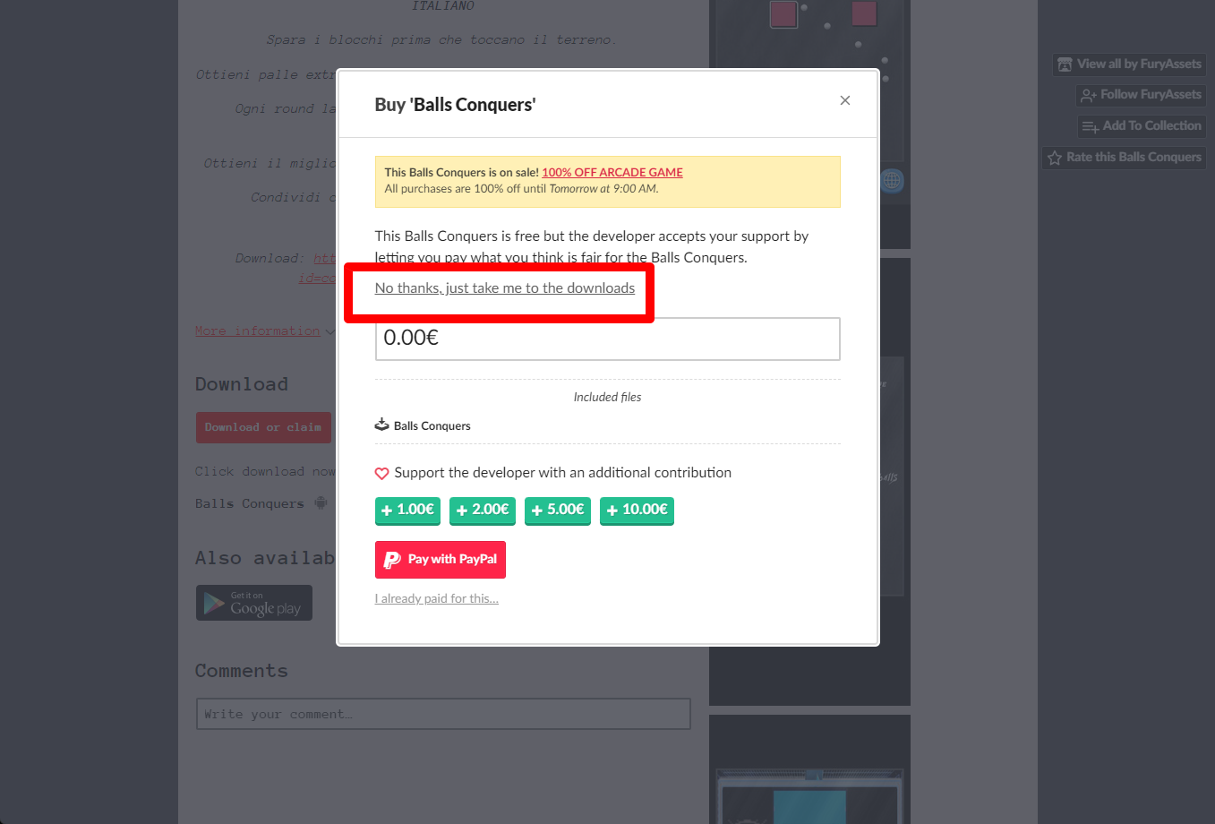 "Balls Conquers" 구매창에서 [No thanks, just take me to the downloads] 링크를 클릭합니다.