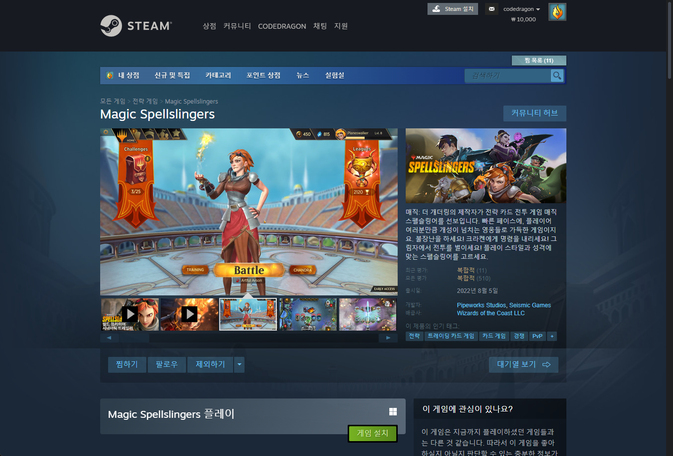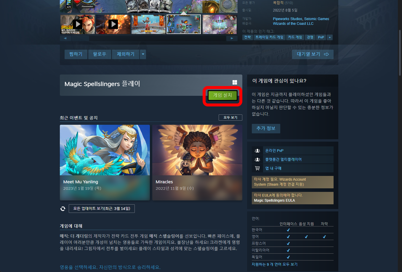 "Magic Spellslingers" 페이지를 내려 [게임 설치]를 클릭하면 됩니다.