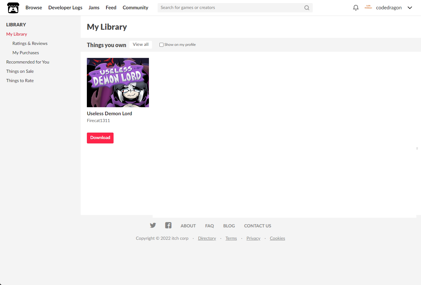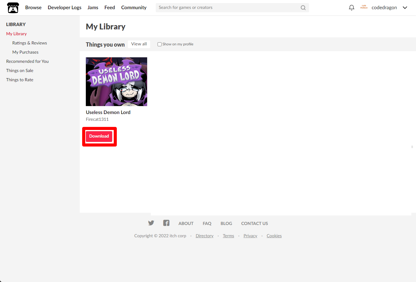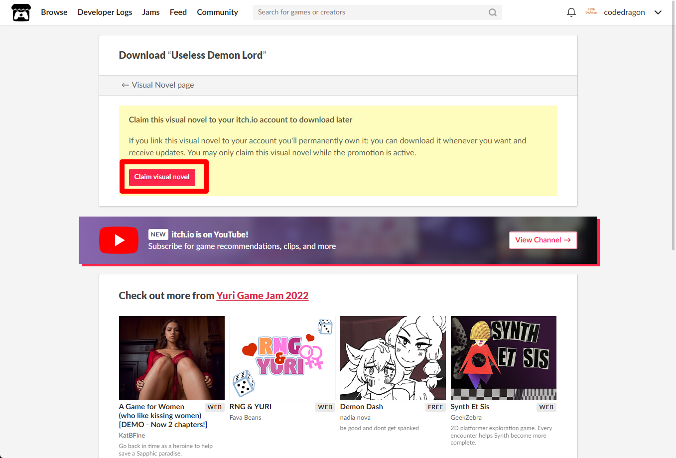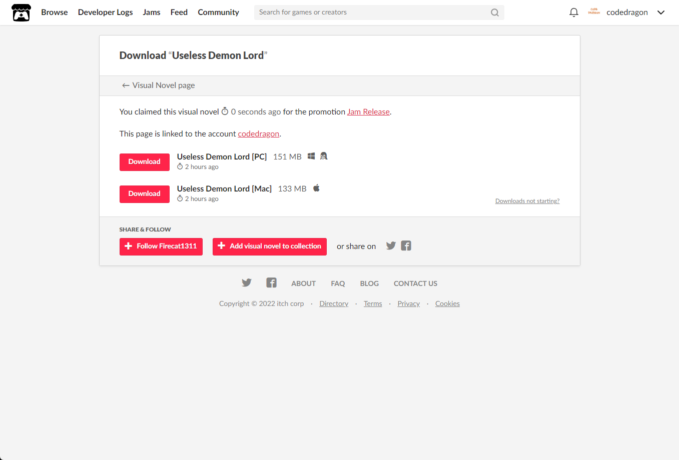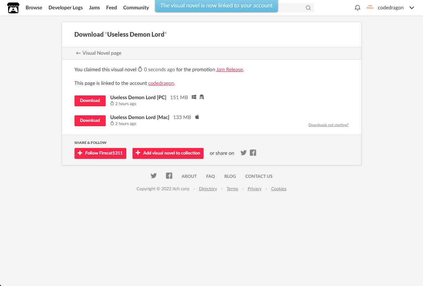 [Claim visual novel]을 클릭하면 "Useless Demon Lord" 게임이 나의 게임 라이브러리에 추가되고 설치파일을 다운받을 수 있는 페이지로 이동됩니다.