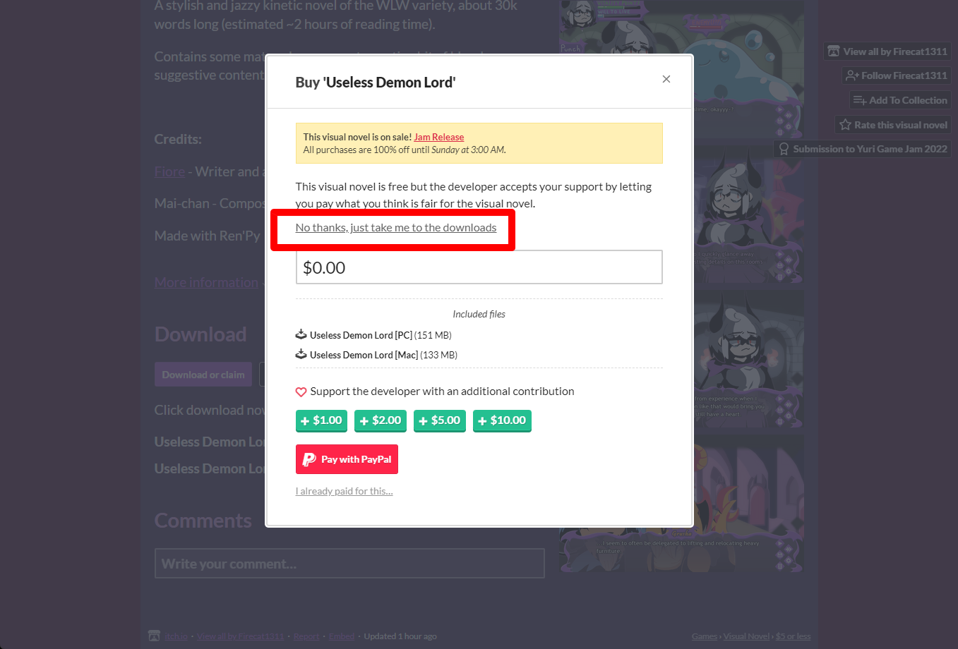 "Useless Demon Lord" 구매창에서 [No thanks, just take me to the downloads] 링크를 클릭합니다.