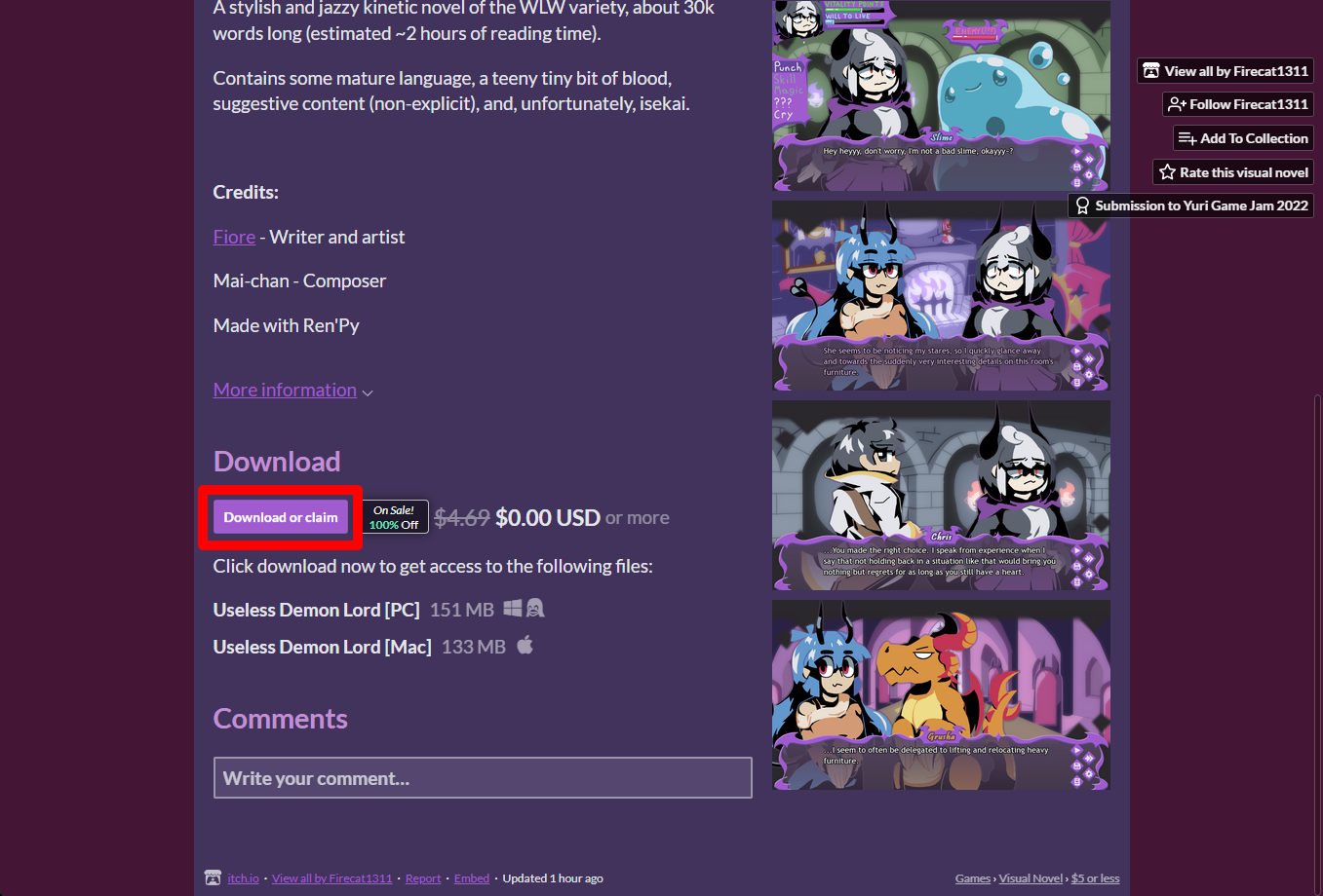 "Useless Demon Lord" 페이지에 있는 [Download or claim]을 클릭합니다.