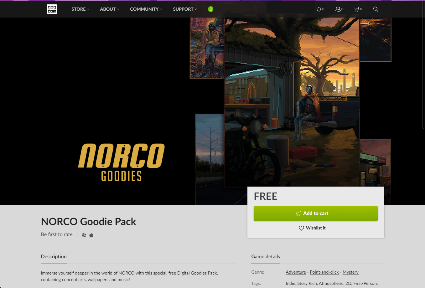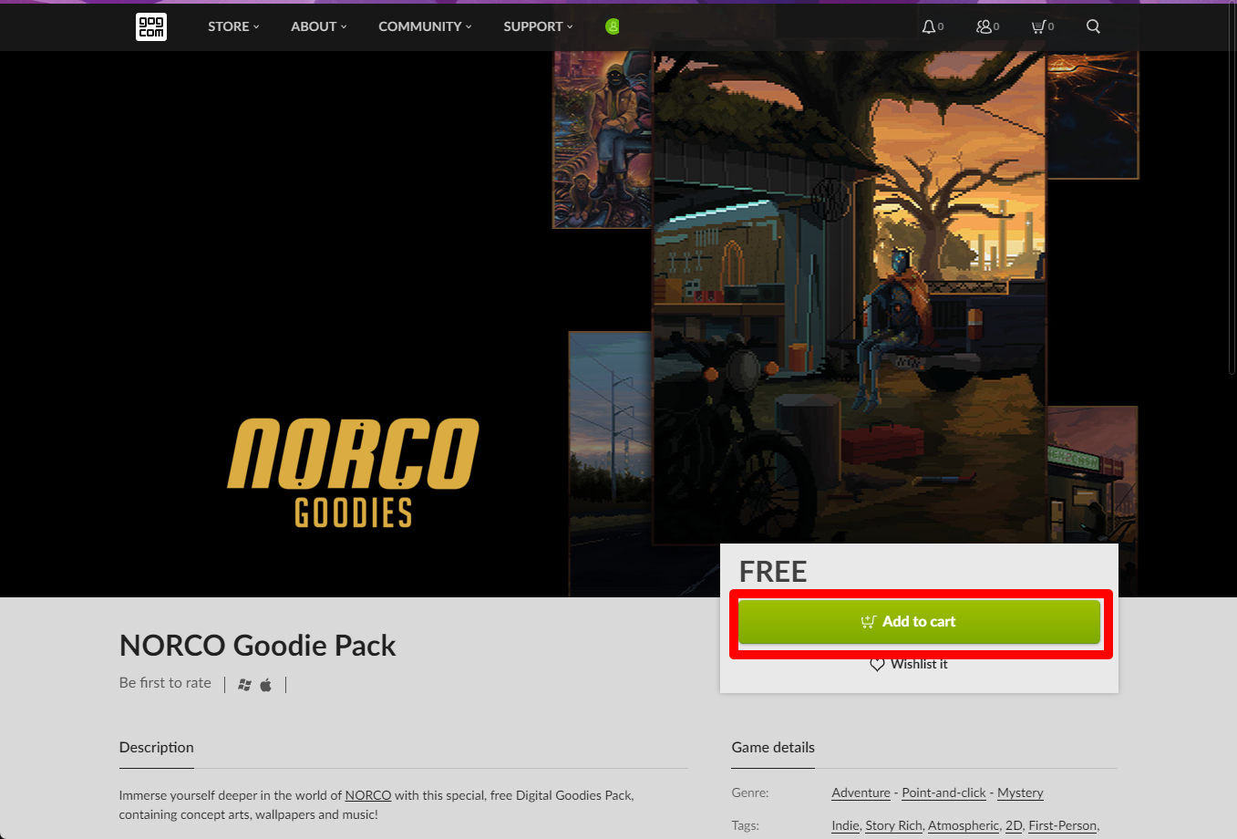 "NORCO Goodie Pack" 게임을 담기 위해 [Add to cart]버튼을 클릭합니다.