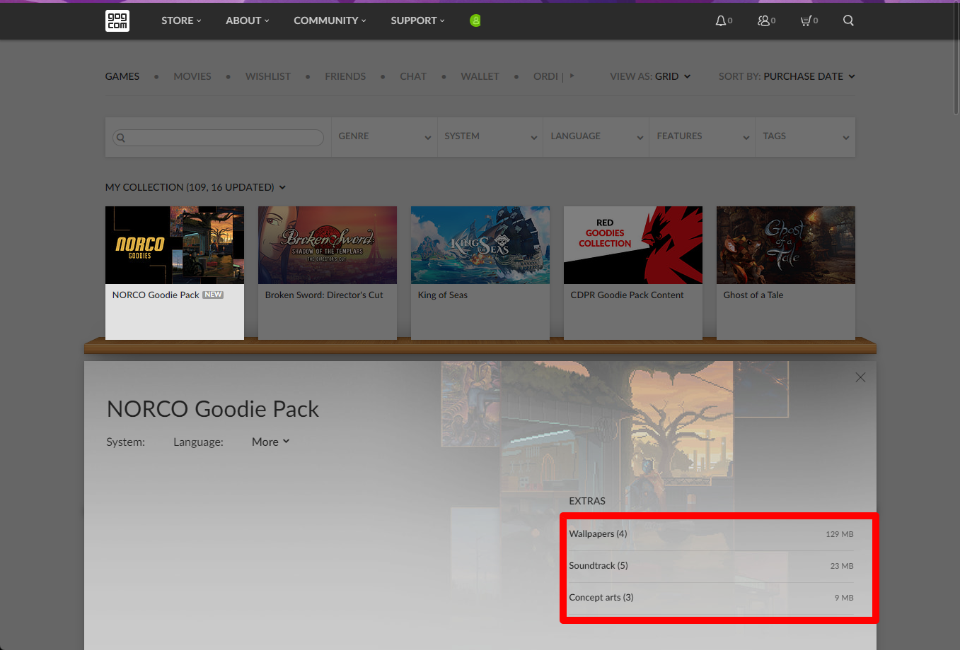 "NORCO Goodie Pack" 게임 라이브러리 확인
