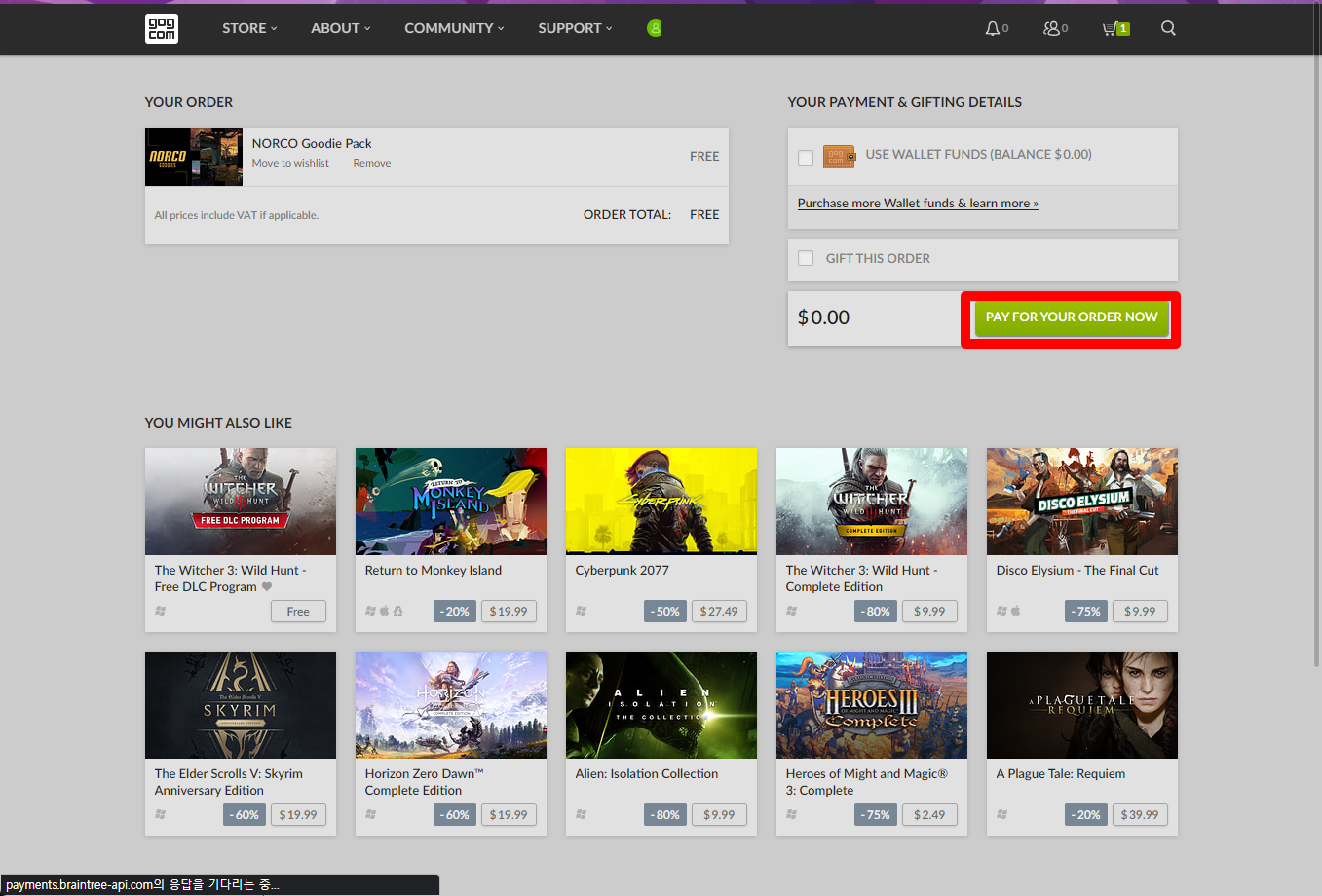 "NORCO Goodie Pack"게임이 담긴 상태에서 결제페이지로 이동됩니다. [PAY FOR YOUR ORDER NOW] 버튼을 클릭해서 0원으로 구매하겠습니다.