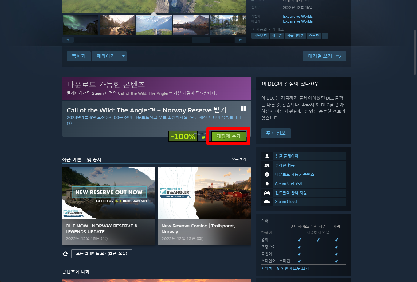"Call of the Wild: The Angler - Norway Reserve" 게임페이지를 조금 내려준 후 [계정에 추가] 버튼을 클릭하면 게임라이브러리에 추가됩니다.