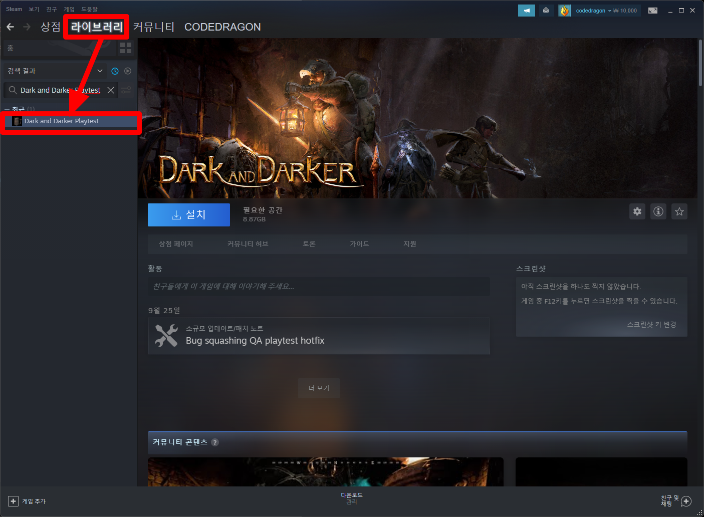 스팀런처의 상단 [라이브러리] 메뉴에서 방금 받은 "Dark and Darker" 게임을 확인할 수 있습니다. [설치] 클릭해서 설치완료 후 플레이하면 됩니다.