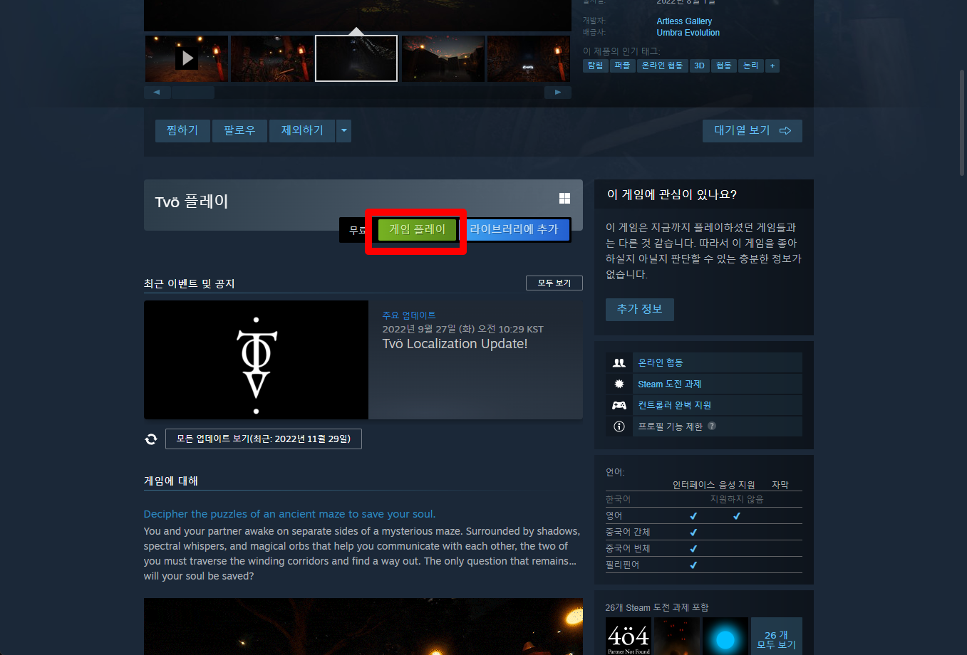"Tvö" 페이지를 내려 [게임 플레이]를 클릭하면 됩니다.