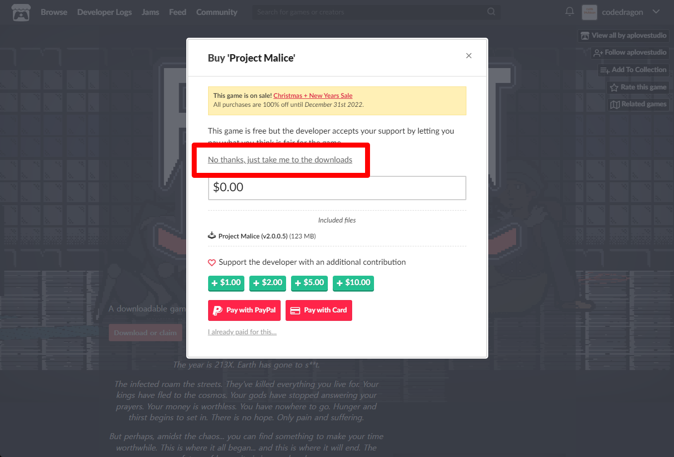 "Project Malice" 구매창에서 [No thanks, just take me to the downloads] 링크를 클릭합니다.