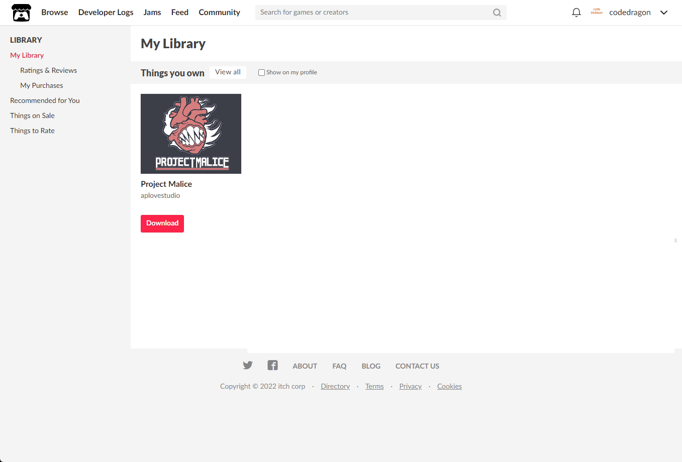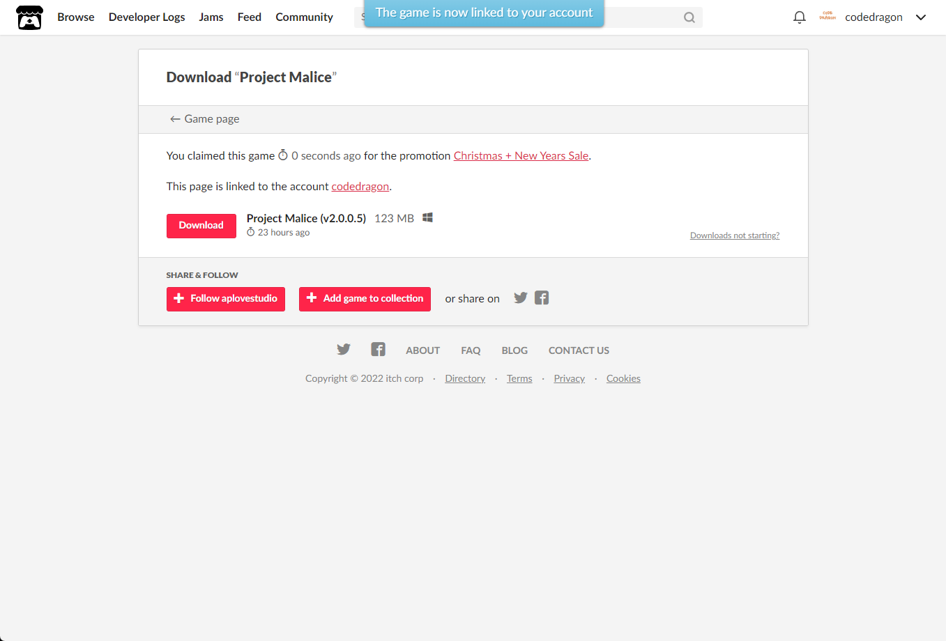[Claim game]을 클릭하면 "Project Malice" 게임이 나의 게임 라이브러리에 추가되고 설치파일을 다운받을 수 있는 페이지로 이동됩니다.