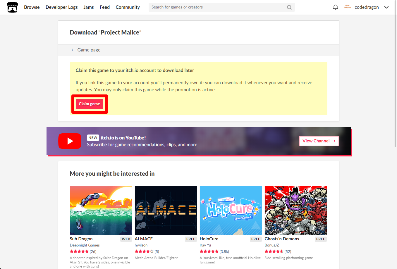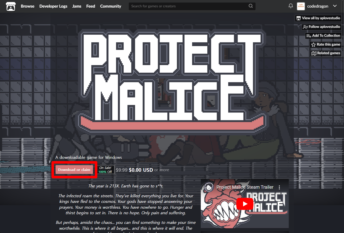 "Project Malice" 페이지에 있는 [Download or claim]을 클릭합니다.